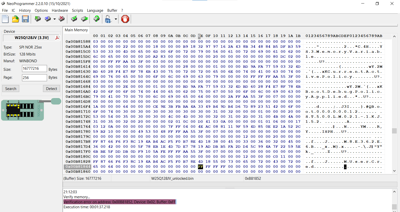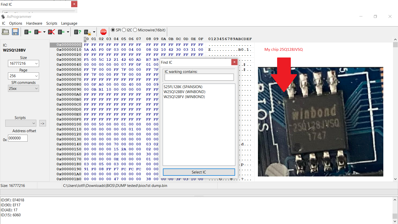 I'm trying to unlock my bios, I lost the password of my HP Probook 440 G5 Laptop. But my problem is when I try to dump my BIOS AsProgrammer gives me two chips options in "Find IC" but my BIOS chip is Winbond 25Q128JVSQ