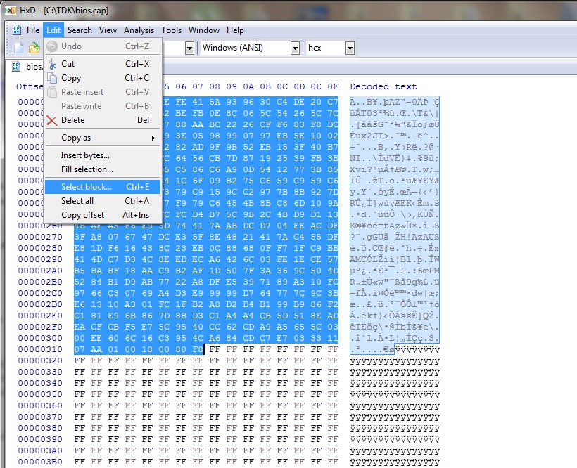 Open the file bios.cap with HxD. Click on Edit - Select block or use Ctrl+E .The length of the header we need to remove in hex is 318 ,set the Start-offset at 0 and the End-offset at 317 and click on OK . Delete the selected part using Edit - delete ,or the Del/Delete key on your keyboard.