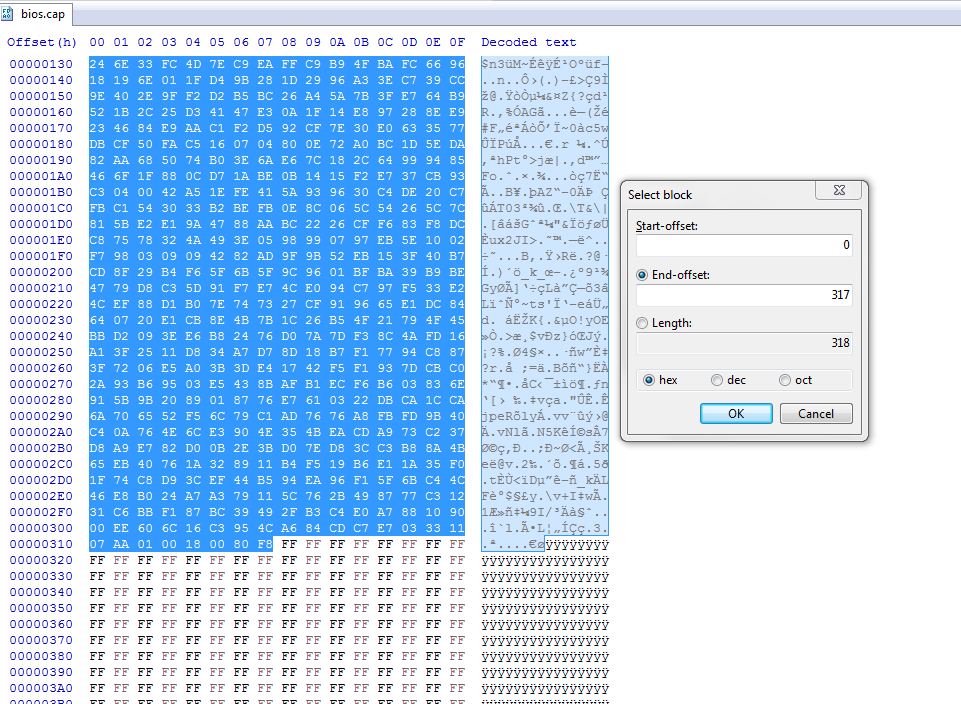 Open the file bios.cap with HxD. Click on Edit - Select block or use Ctrl+E .The length of the header we need to remove in hex is 318 ,set the Start-offset at 0 and the End-offset at 317 and click on OK . Delete the selected part using Edit - delete ,or the Del/Delete key on your keyboard.
