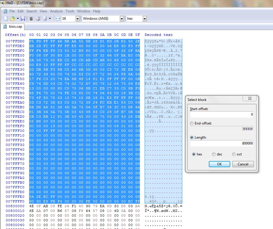 Next, select Edit - Select Block or Ctrl+E and set the Start-offset at 0 ,click on the Length button and enter 800000 (as the length), or choose the End-offset instead and set to 7FFFFF.