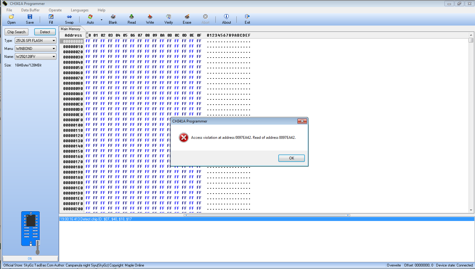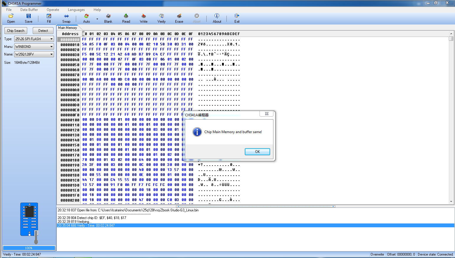 Found Winbond flash chip "W25Q128.V" (16384 kB, SPI) on ch341a_spi.