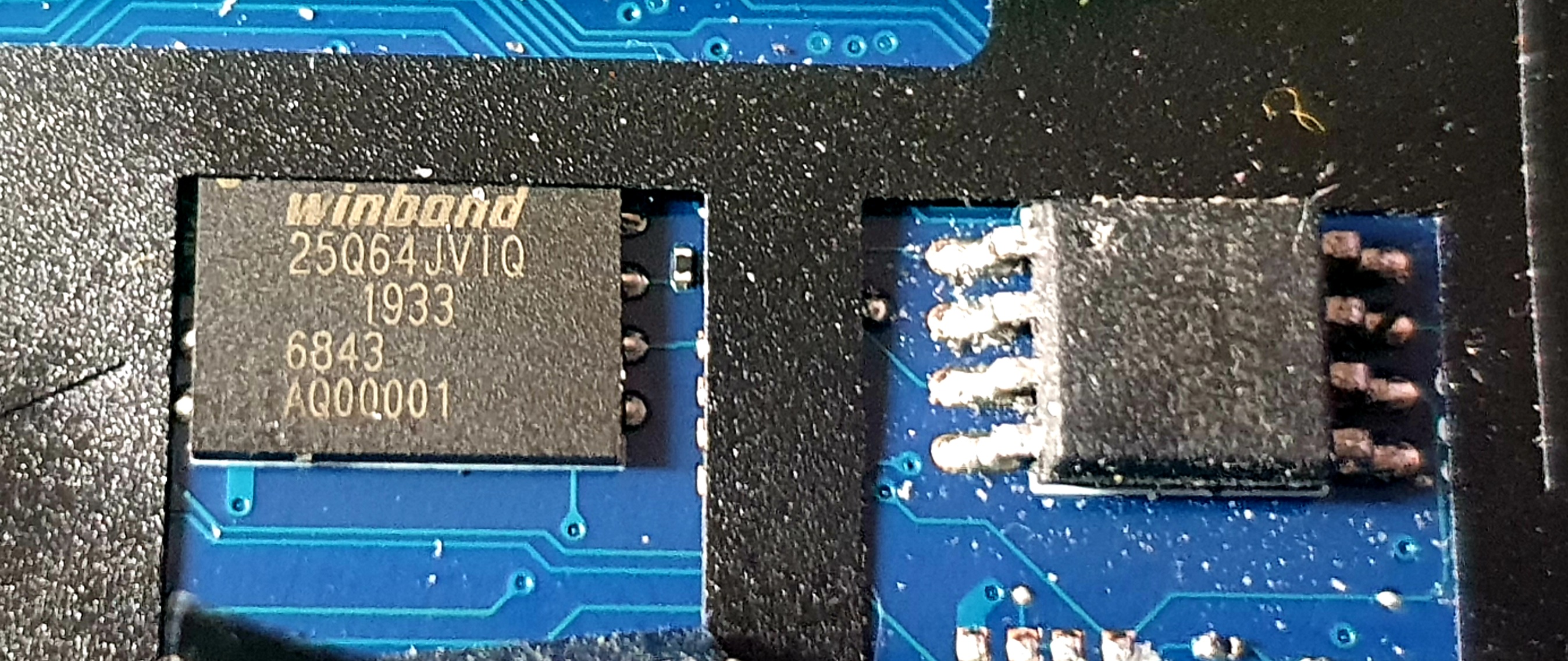 One is 25Q128 and it is the BIOS (main program) and the second is a 25Q64JVIQ WSON 8x6mm and I suppose it contain the passwords and other non volatile information.