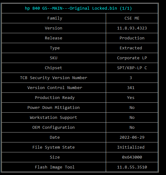 I was struggling to find on internet ME Fw 16.1 27.2225 Corporate LP ADP A for HP 640 G10 and I had the idea to use MFIT 16.1 to extract ME Firmware from update package and ... it works!