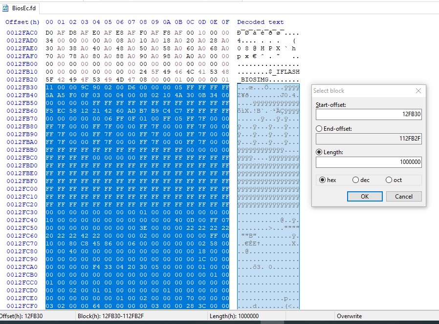 How do I cut form the top of the new bin to the last? do I need to know what is the excat offset? and hw do I know? I already found where is the first and the last of the new bios bin in the hexeditor. but I cant cut it if I do it manually