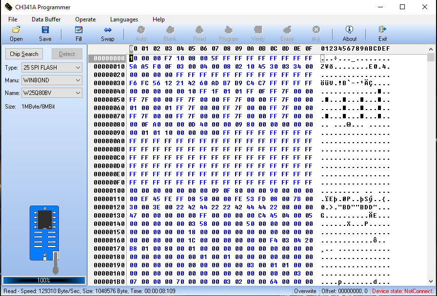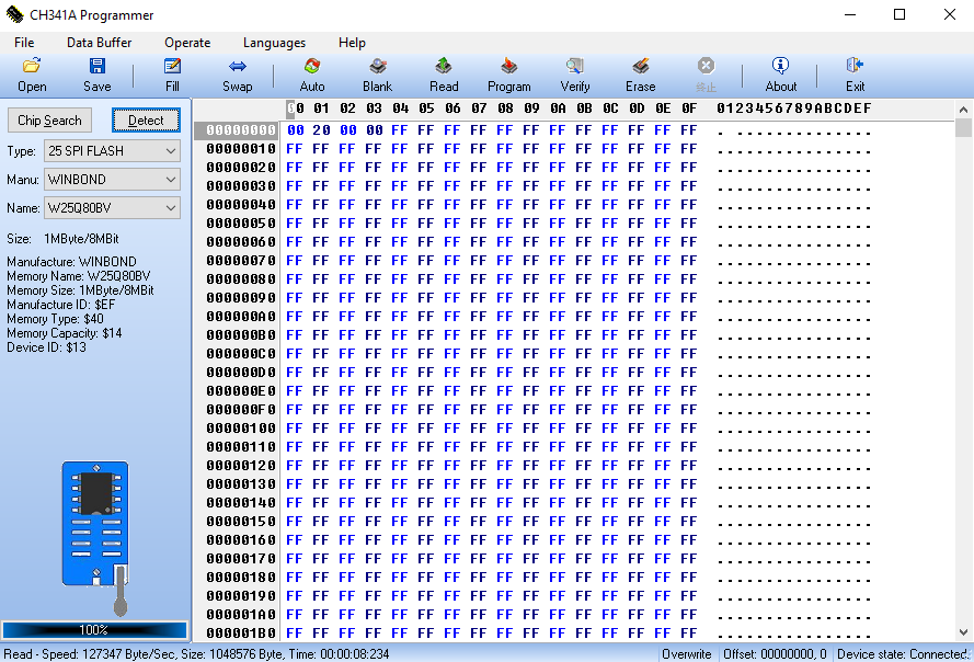 The Programmer detect: W25Q80BV Size 1MByte/8MBit