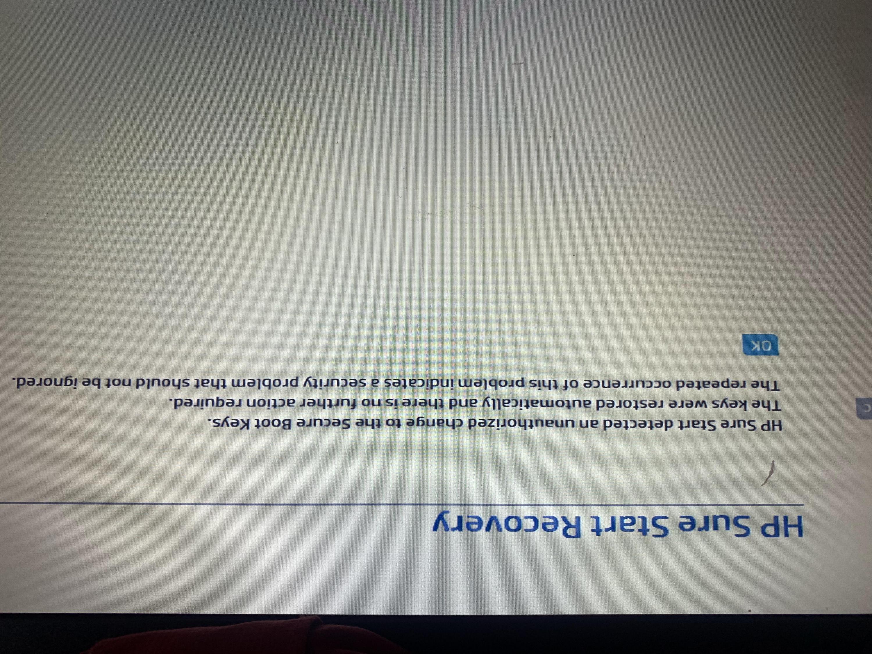 Hi guys can anyone help me and fix my bios. Laptop it's stuck on Hp sure start recovery screen when i press ok laptop restart and comeback to Hp sure start recovery and it doesn't go to bios settings