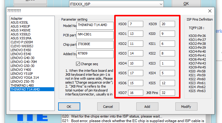Please can you send me a liml or name of the correct programmer to remove T14 password. i know people using RT809H , but do i need any other JIGs for it? how i connect RT809H to the MainBoard to reprogram it? JTAG ? if yes can you send me picture of jtag pinout .. if its not JTAG then i believe its done thru keyboard connector ?