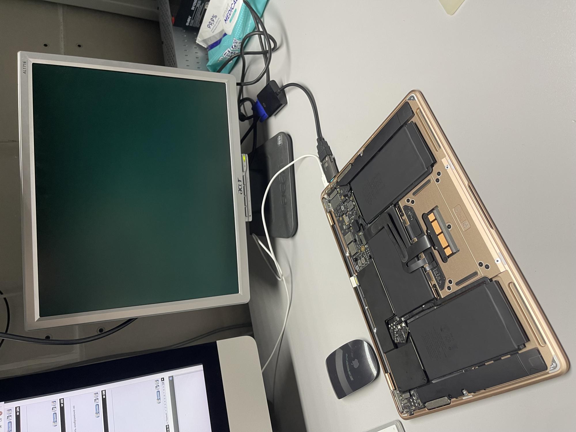 d. Plug the C cord in the first port of the MacBook into the other Mac, then power off the MacBook