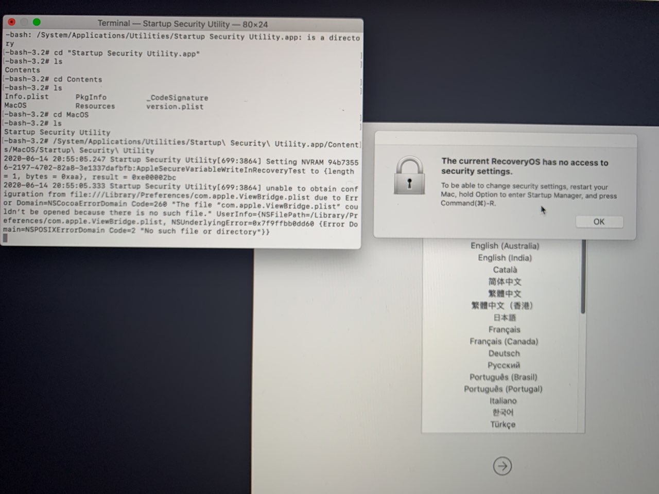 may i ask you how to open terminal on T2 mac on wich step you did that ? i need your assistance to reproduce it please. i tried to hold cmd+t with no success.