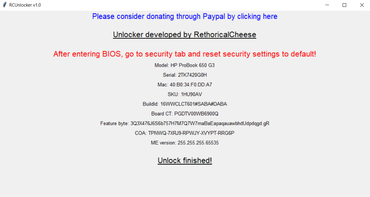 Could someone help me what to do and how to do it? I bought an HP probook 650g3 laptop and found a locked bios at home. I tried various tutorials, none of them helped. I finally found a forum where I could unlock the bios. I downloaded RCUnlocker v1.0, I move the bin file to it, it says bios unlocked. After restarting the laptop, where I try f10 in the bios, it still needs a password. What am I doing wrong?