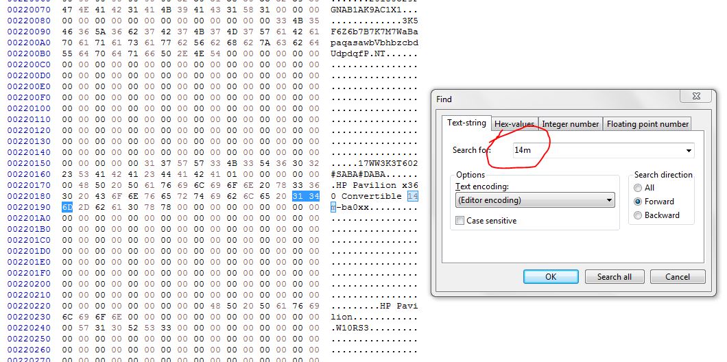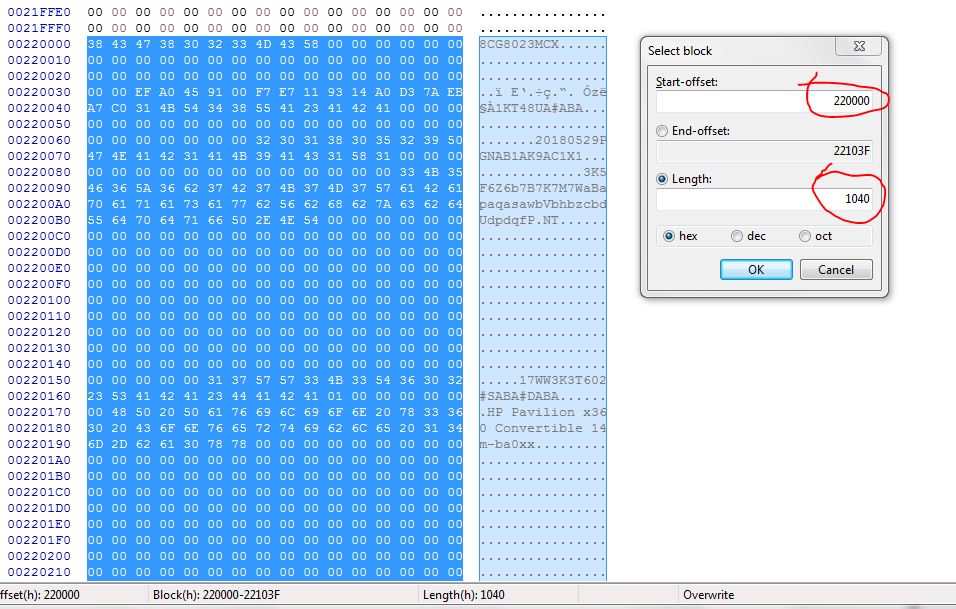 Go to the HP support site and enter the serial number on the case to search for driver and bios updates.Download the bios update executable - https://ftp.hp.com/pub/softpaq/sp133...0/sp133137.exe .Run sp133137.exe ,you`ll see a quick message about extracting an "insyde" bios. If you get a warning message about installing an insyde driver you can choose not to install it,it will pop up about 3 times.After the final warning a screen pops up with 3 options.Update,Make a recovery USB or copy. Choose the copy option and select a folder to save to. The bios is extracted to the folder you chose,there are 2 different ones,as the updater supports more than one machine.Open your bios backup with a Hex Editor and use the text search function to look for 083 ,you will see bios you need is 0830F .Next look for the laptop model number, the DMI (serial number,feature byte,win key) is all in one block.Open the 0830F virgin bios and scroll down to 220000 you will see that area starts with 00`s (not FF`s) ,go back to your backup and select the offsets in the picture, copy and paste insert into the virgin bios using the same offsets and save.