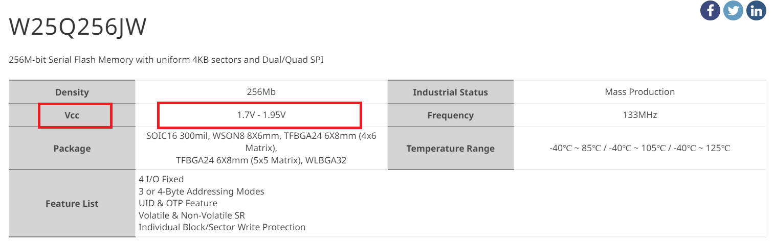 My chip is "JV" and I saw on datasheet that it requires 2.7v to 3.6v. So I think it is supported.