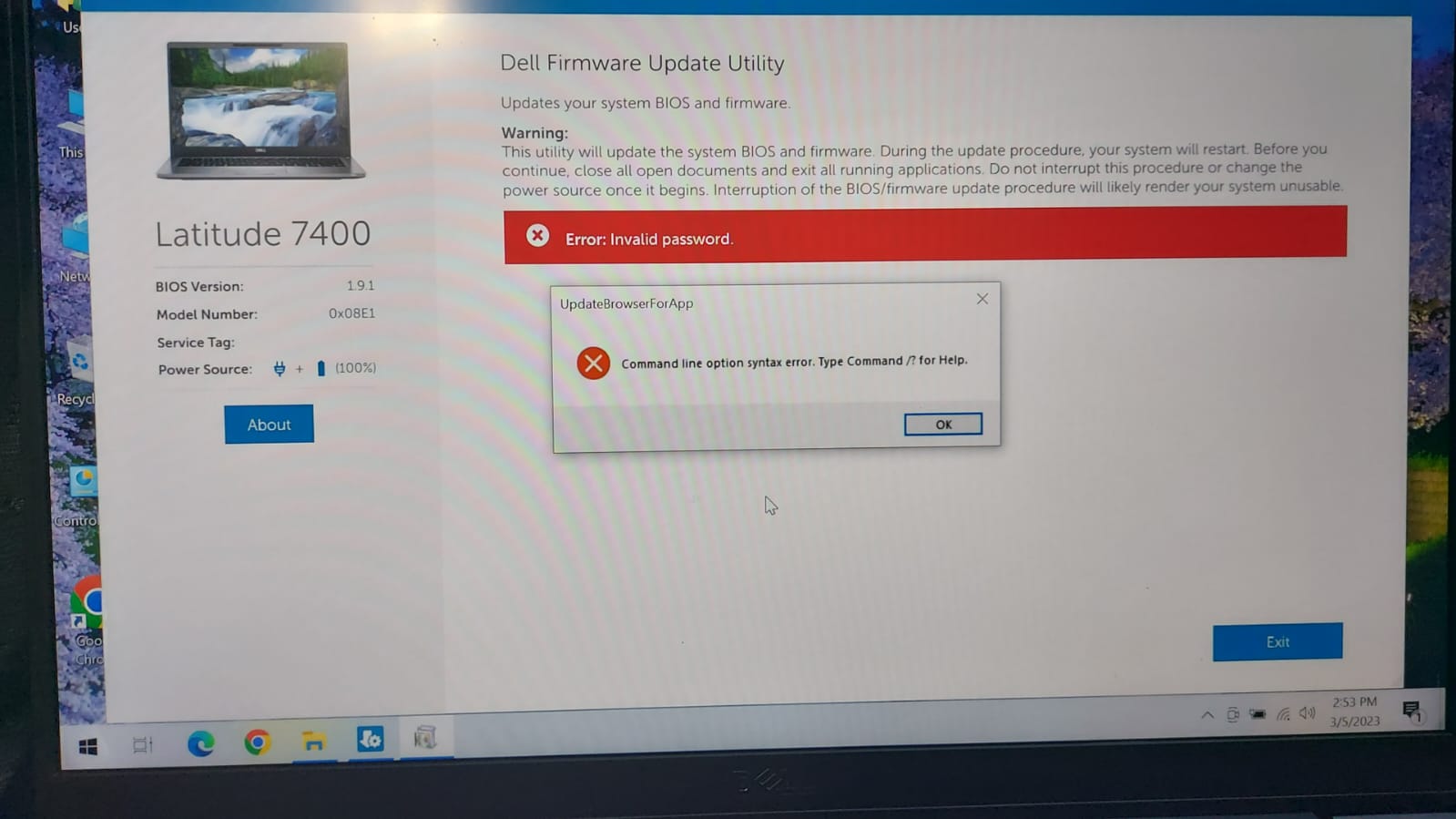The error is shown on the screen - invalid password. You must input the correct (bios) password, or better remove the password, then update the bios. If you like afterwards you can set the admin password again.