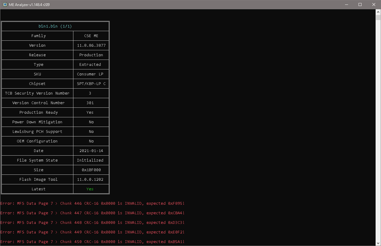 I suspect it is a BIOS issue. So I decided to try to clean the ME region. I followed the guide on win-raid, and I believe I have done everything correctly. My problem is: when I open the outimage.bin in ME Analyzer, it says that it is Extracted, and not Region, Extracted as it should be. Is it normal, or did I do something not correctly? This is my first experience editing BIOS files.