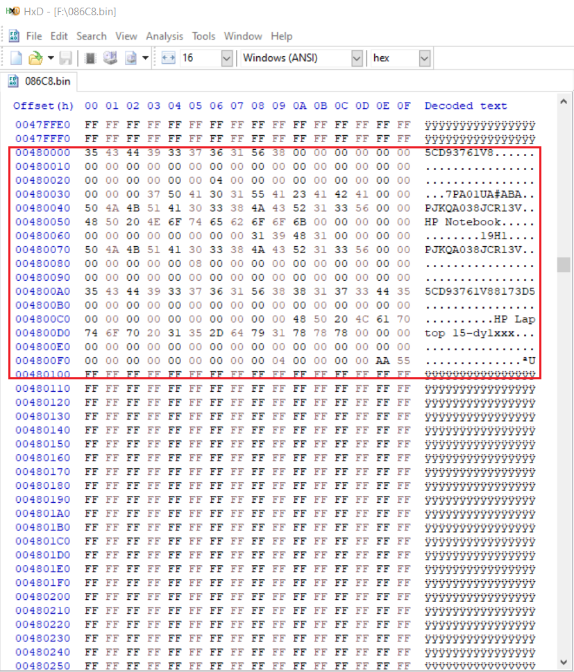 I found the BIOS from the Hp site. Got the BID info from Original BIOS "086C8" which is for my model, Can anyone inform me the end offset length that has to be copied to the new BIOS... Thanks in advance.