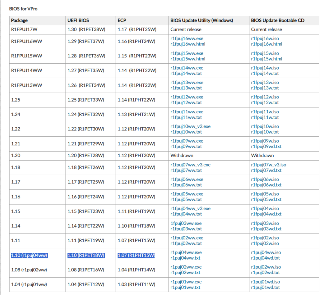 My BIOS1 seems to be of the first UEFI releases for this board 1.10 (r1puj04ww) 1.10 (R1PET18W) 1.07 (R1PHT15W). Which is 17 releases behind the current one.