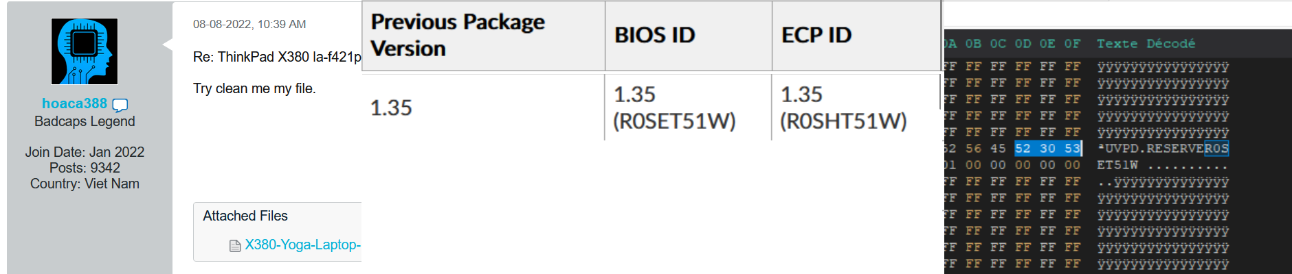 Hello, I have a Lenovo x380 with bios password and computrace ; I have followed this guide from MaxPower (Thanks for the tutorial ) : https://www.badcaps.net/forum/troubl...-ec-pwd-bypass ; Unfortunately , the method failed as there was a risk of bricking . Now , the laptop keyboard light up and down but there is no post no lenovo logo nor display. fan run one time then shut down. I think that the bios may be corrupted. Hence, i have made a copy of the corrupted bios. Can you please see make a new working bios ? Thank you.