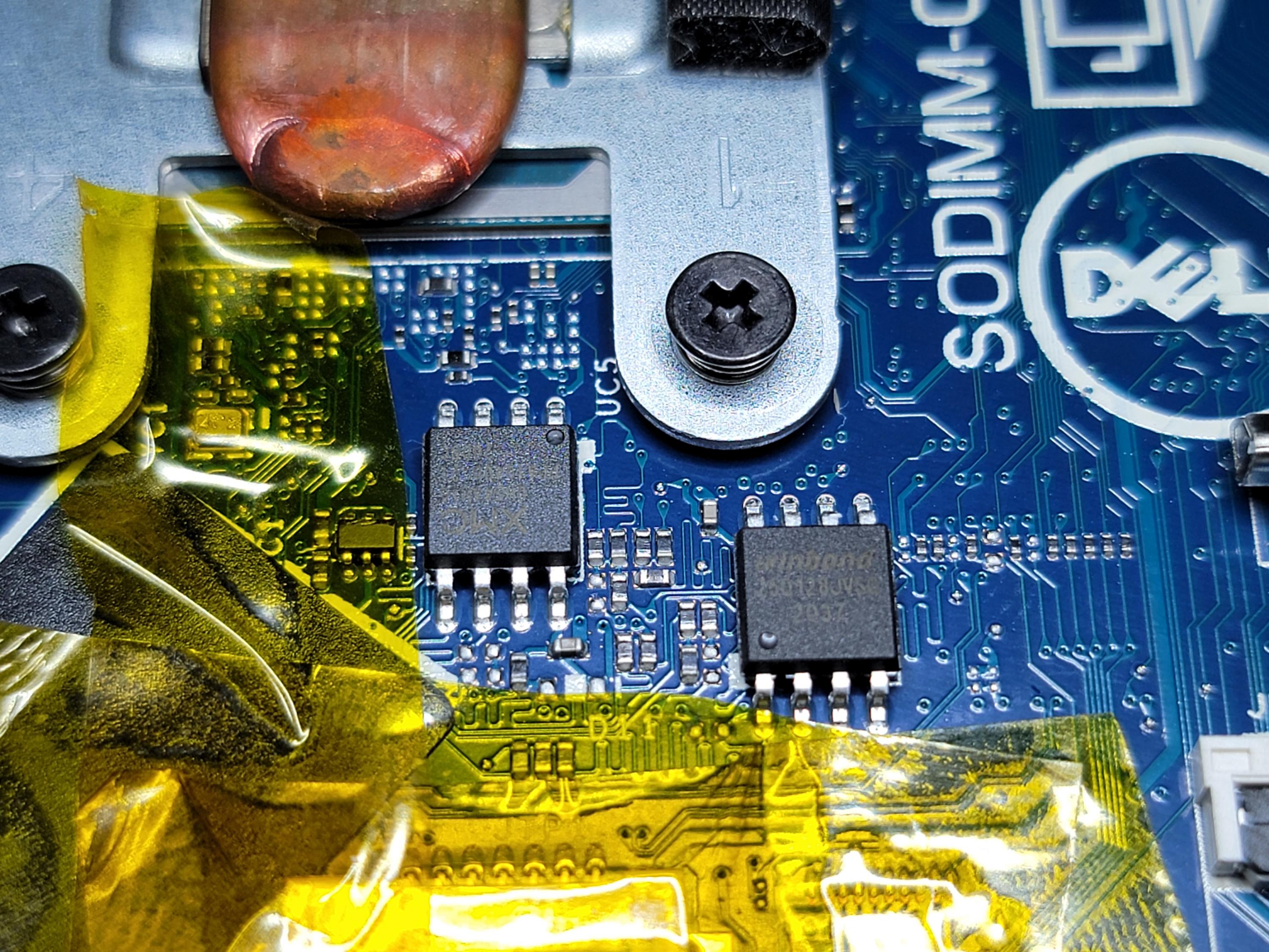Okay i surface mount soldered the chip back, reassembled and now i have no power, no lights, no fan. Before the change, I had power and could boot to BIOS and Windows. Now nothing. The reason for flashing the XMC chip is to correct the Serial number. Could the deletion and downsizing messed with the prompt to boot? I have 19 volts coming in from the charger to the dc in. And 3.3 v going to the chip replaced. But after taking readings on the XMC chip, i switch to the Winbond and get 0v. Has to be the chips not talking to one another. Here is a pic of the solder work. Anything else we can try?