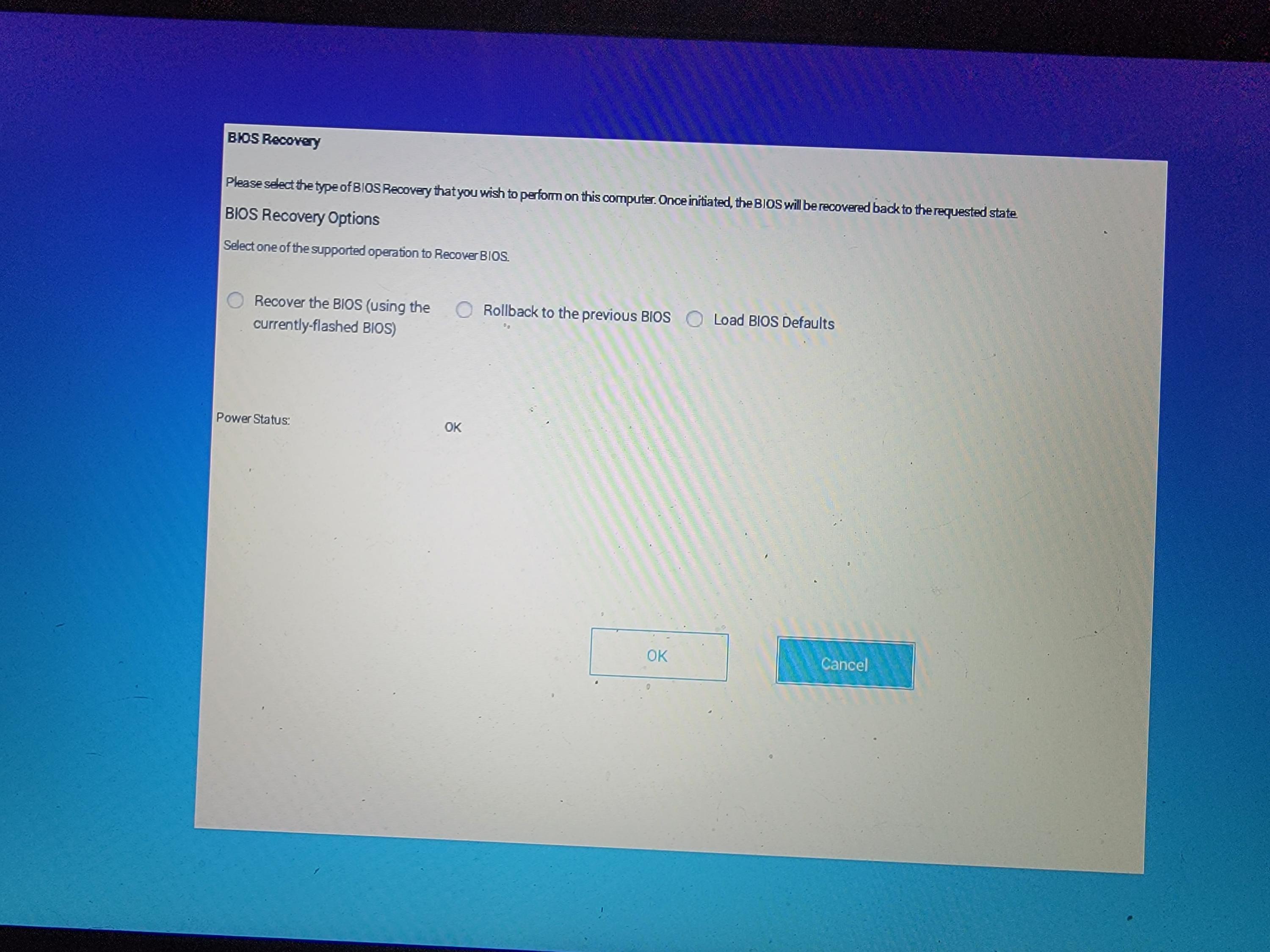 I flashed, mounted and reassembled. Machine boots to BIOS recovery screen but I am not able to recover the BIOS (using currently flashed BIOS). The other options are Rollback to previous BIOS or Load BIOS defaults. Should I just pick Load BIOS defaults?