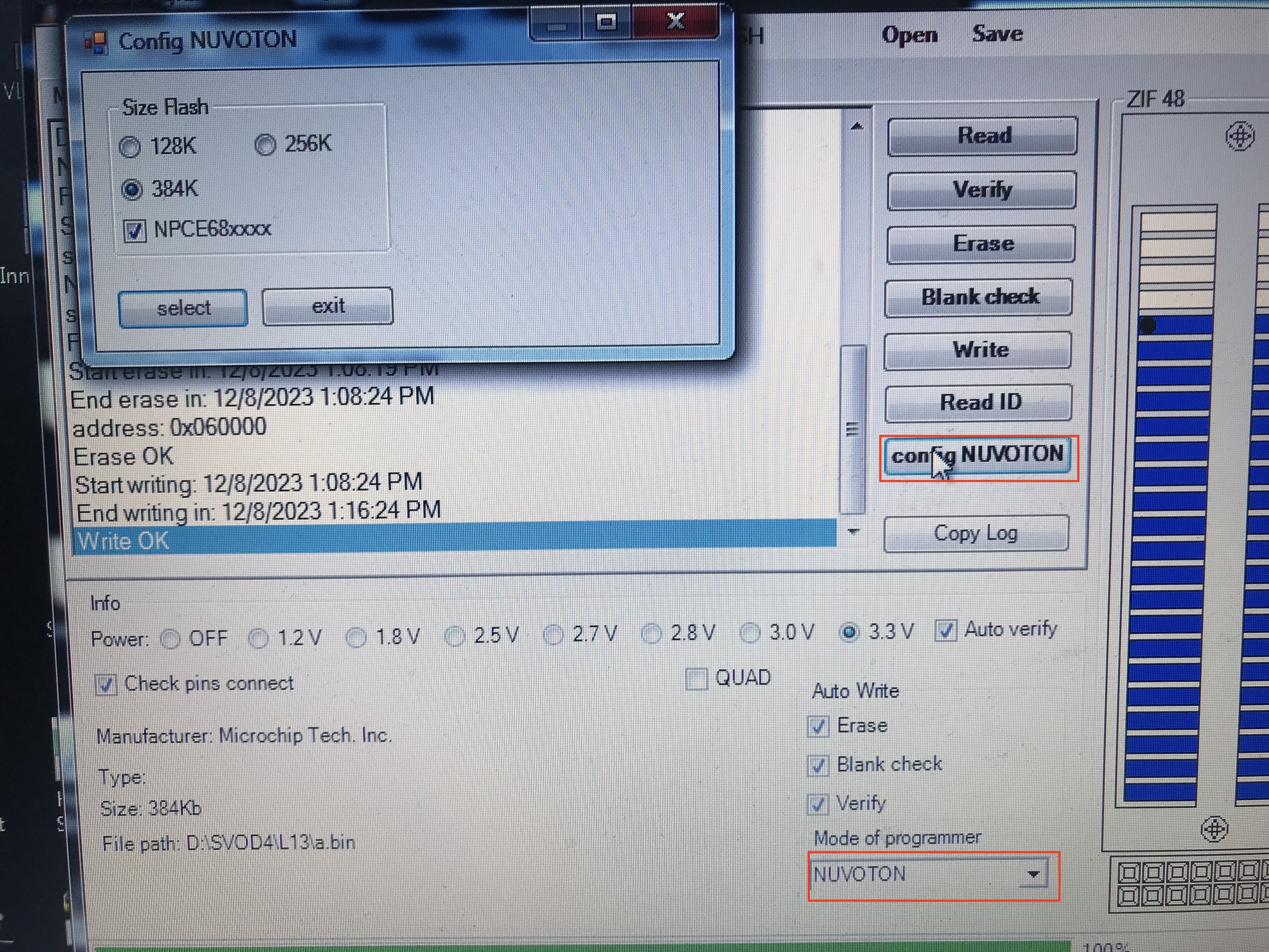 1. set programmer as in photo. Power up motherboard and hit "Read ID" . I got Device ID: 1F20E20F. After that hit " config NOVUTON" and chose 384K and check NPCE68xxx