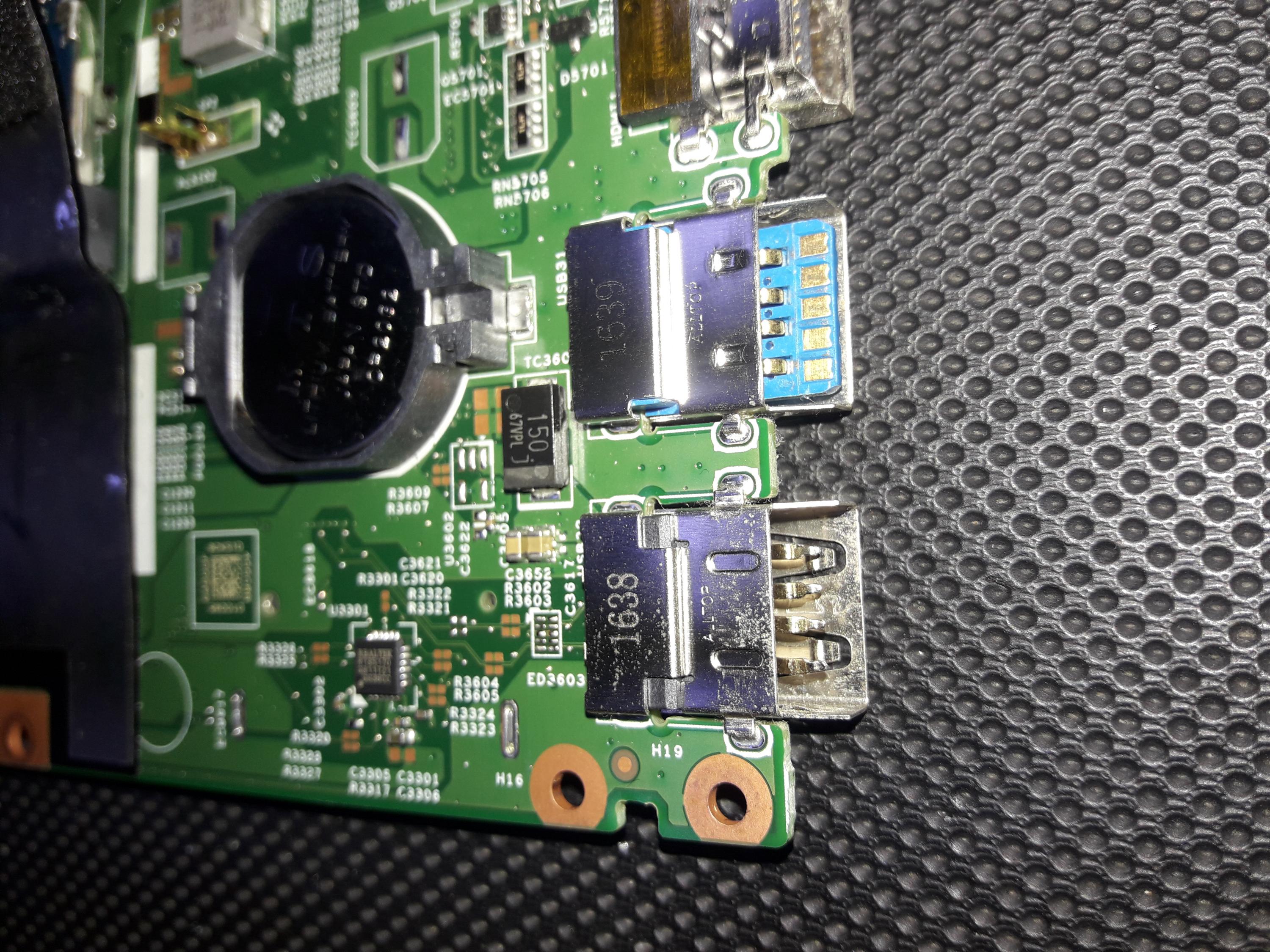 So, I fixed the usb by sacrificing the integrated web camera. Took the camera, cut the cable, identified the power and ground lines + data +/- (always twisted wires), ignored other two, found an unused space on the MB to place a new usb port, soldered the wires, cut the plastic cover of the laptop to support for the new usb port, and it was done. An usb 2.0 port, with something like 3.3 V instead of 5.0V (last measure) but it seems it supports a mouse and/or an usb memory flash.