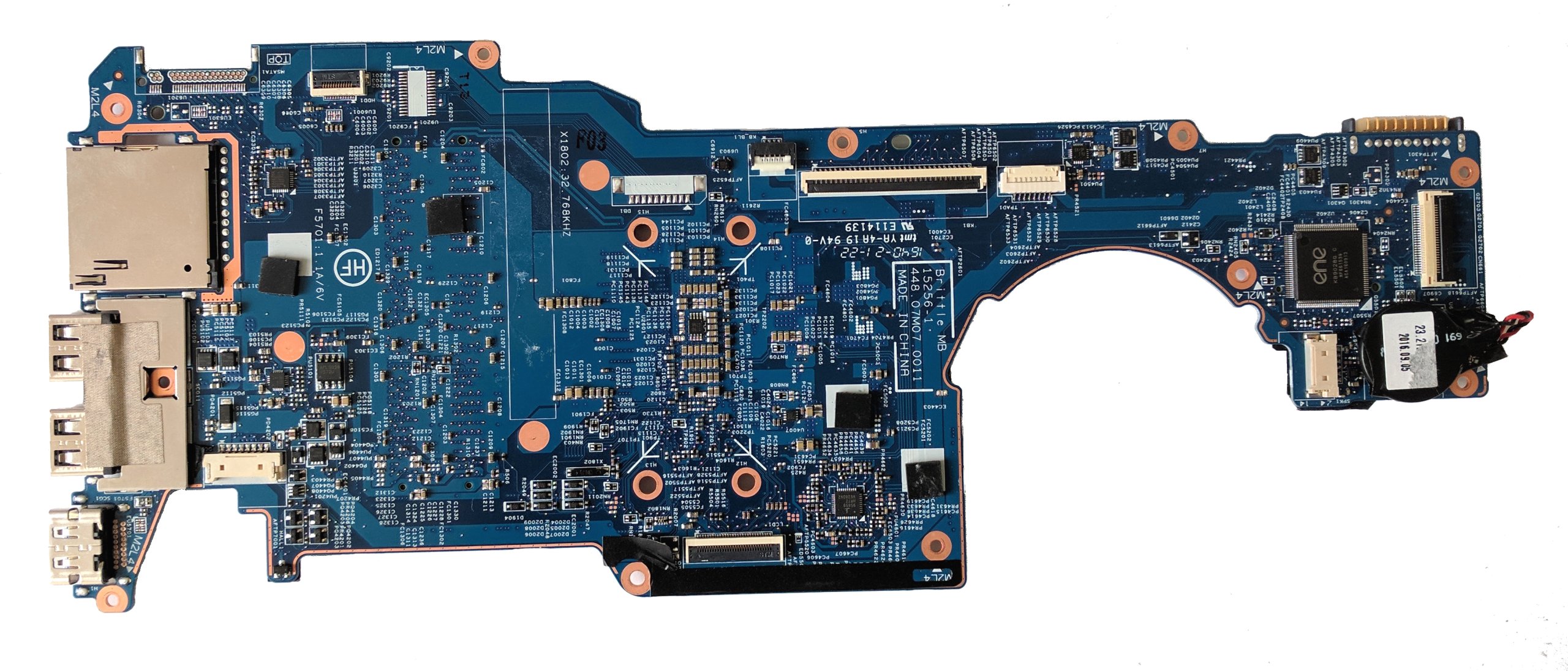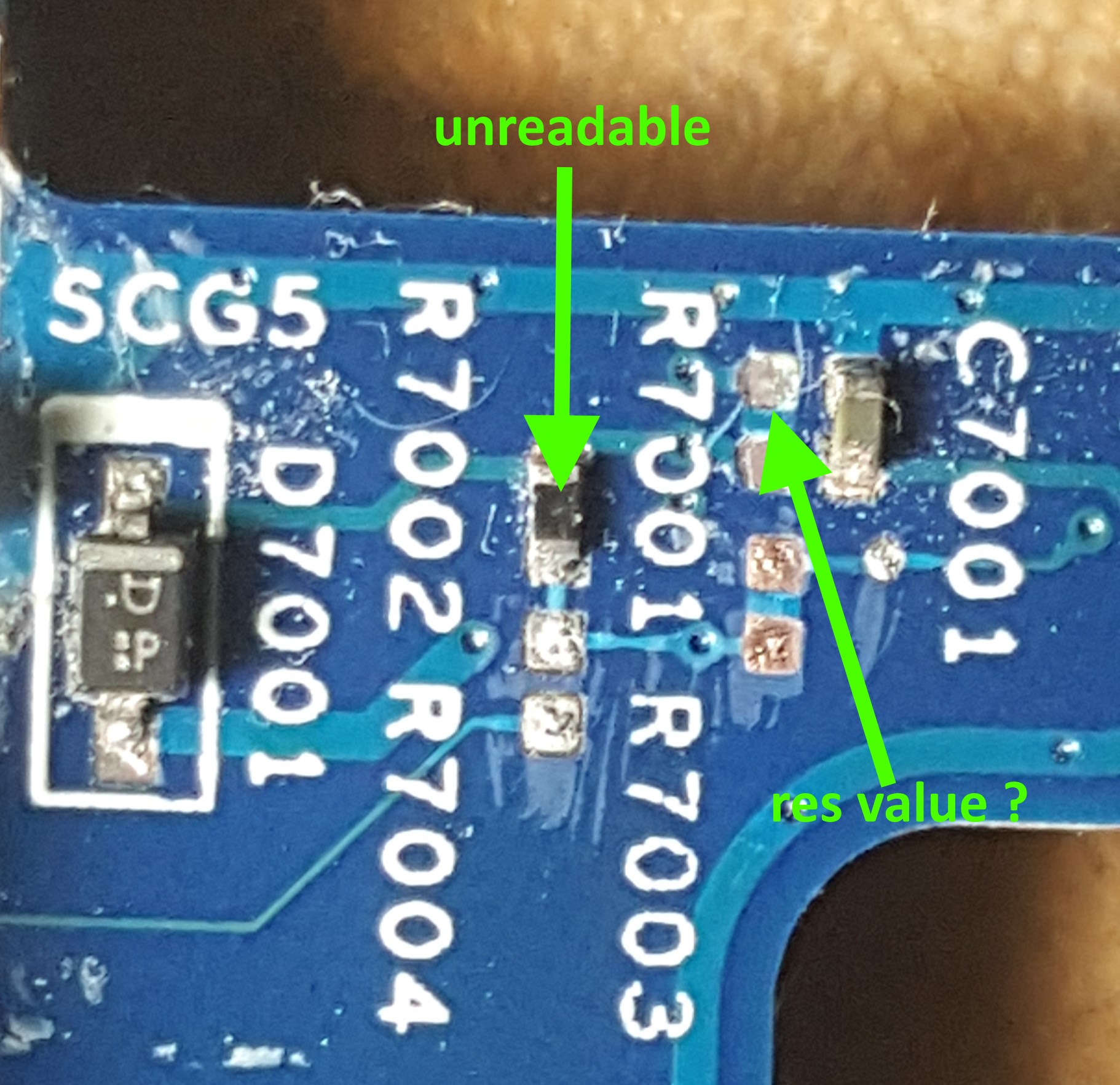 On motherboard there is a liquid spillage area with one missing resistor and one unreadable resistor.