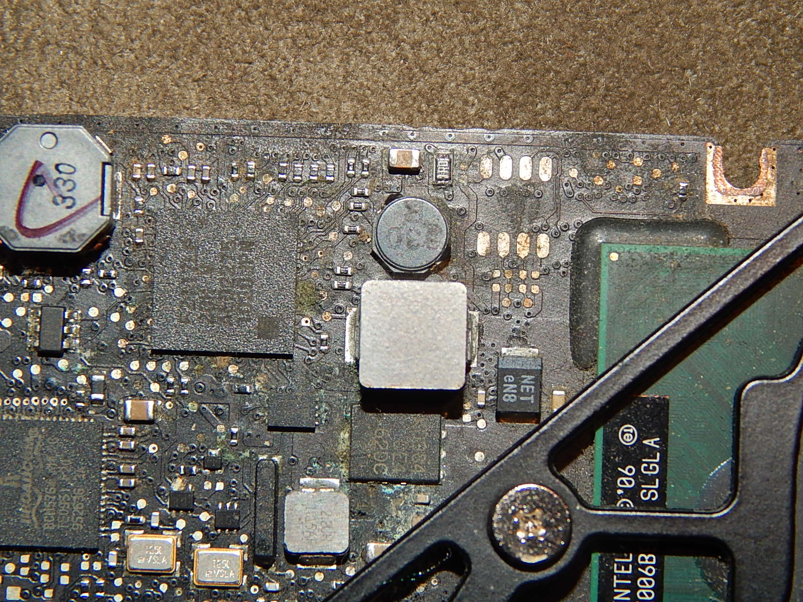I see a bit of corrosion around R6905 so there may be an issue on PP3V42_G3H creation, several corroded vias on U3900 but as long as it's not shorted, it'll only cause no Ethernet. Before cleaning there was green stuff around Q7620. The SMC being right in that area, it may have crap under it as well.