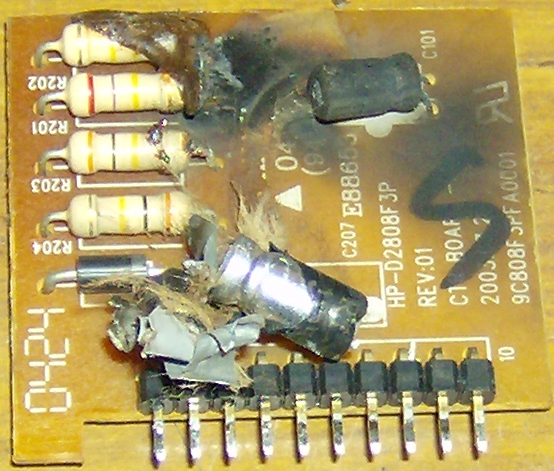 This PSU came in a HP workstation xw4100, looks like the little board labeled "CTR BOARD" had some problems,