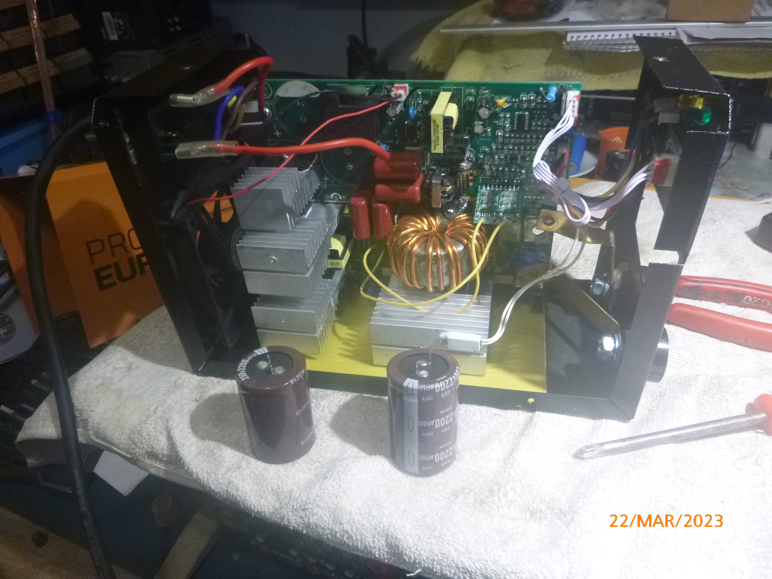 After several attempts at welding down in the garage, I put the open unit on the bench to have a probe around and take some voltage and frequency readings.