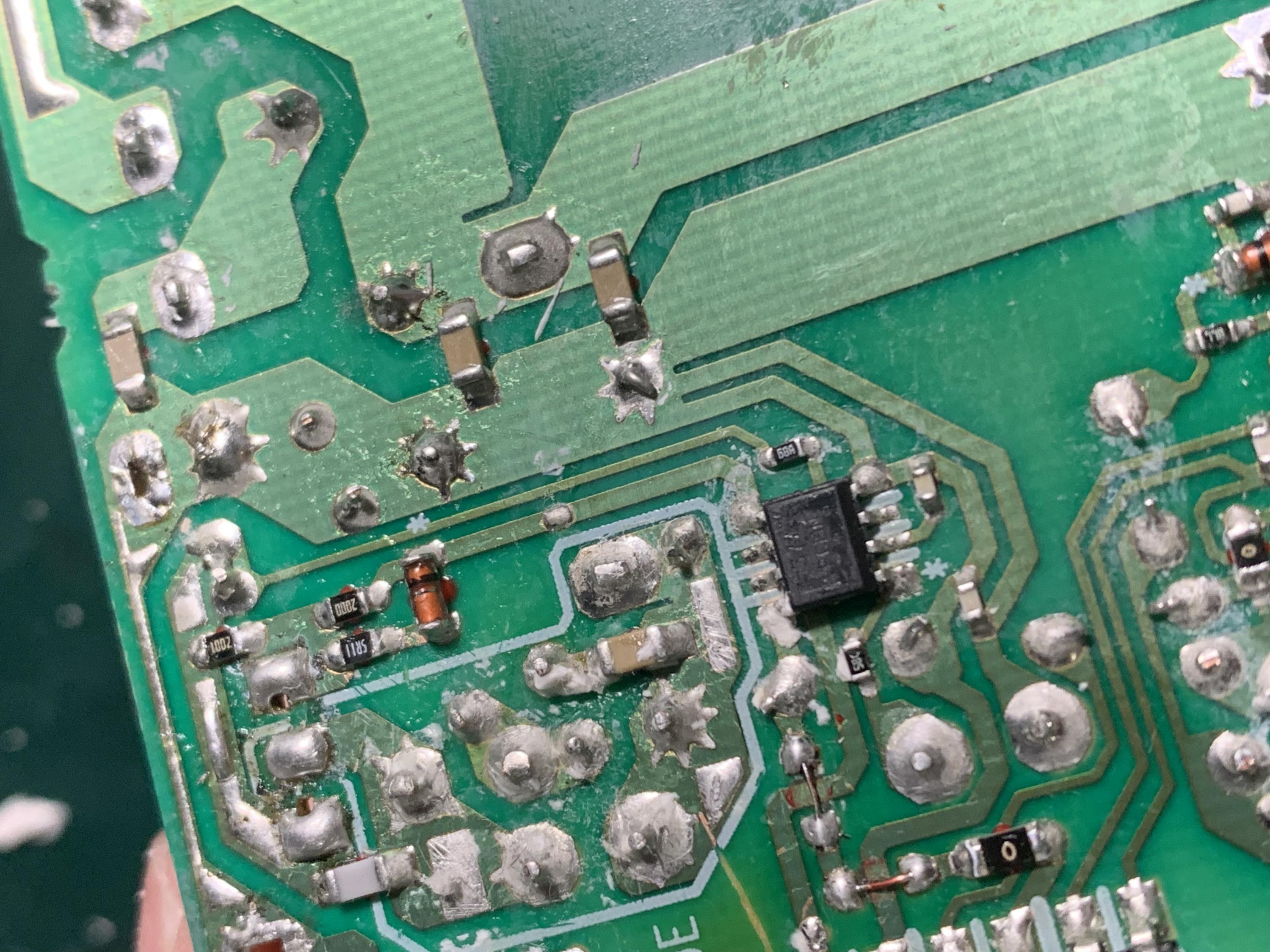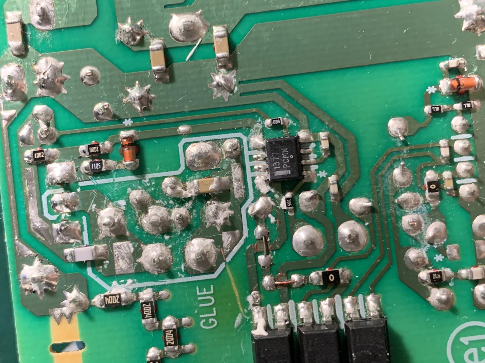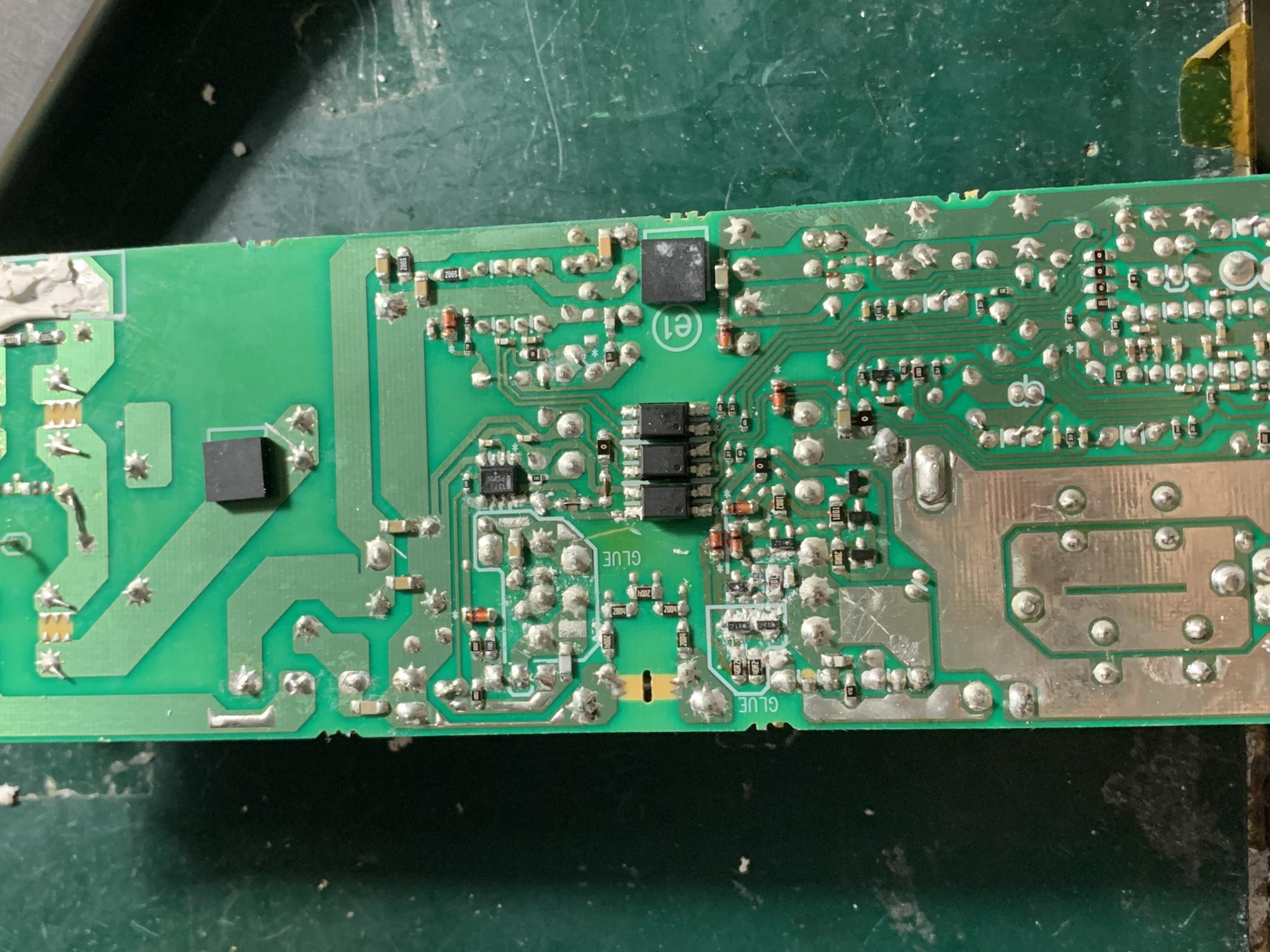 The single switching transistor is driven by a surface mount PWM controller at the underside of the board. I used a multimeter to check the zero fuse resistors, and have found 2 to be blown (I replaced them with jumper wire). They connect the PWM controller through an optocoupler, which are probably part of some voltage feedback circuit. It suggests that something might be shorted, maybe the PWM controller? I can't quite tell the markings on the PWM chip, but it appears to be an IR part.