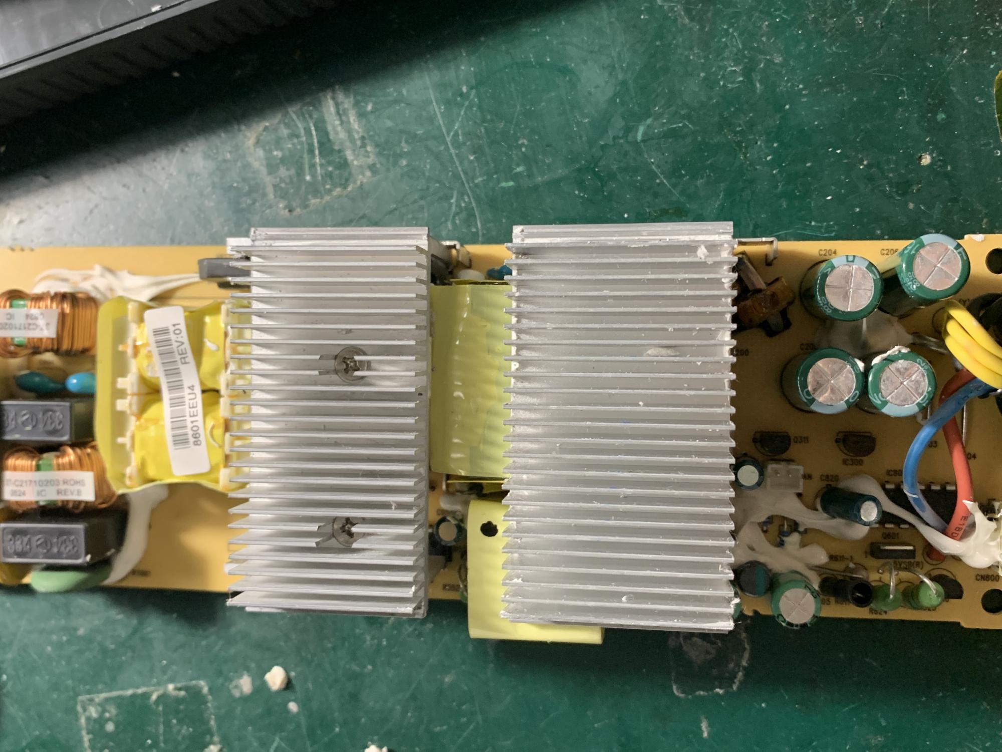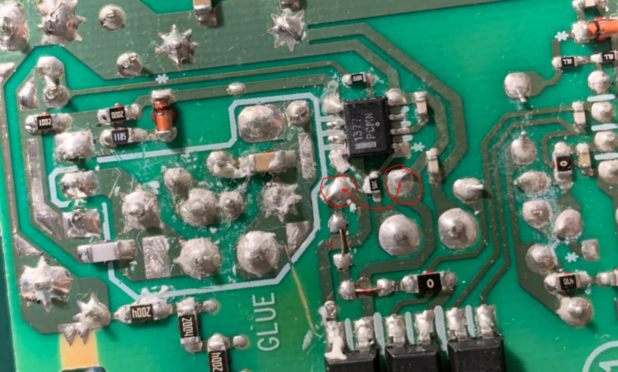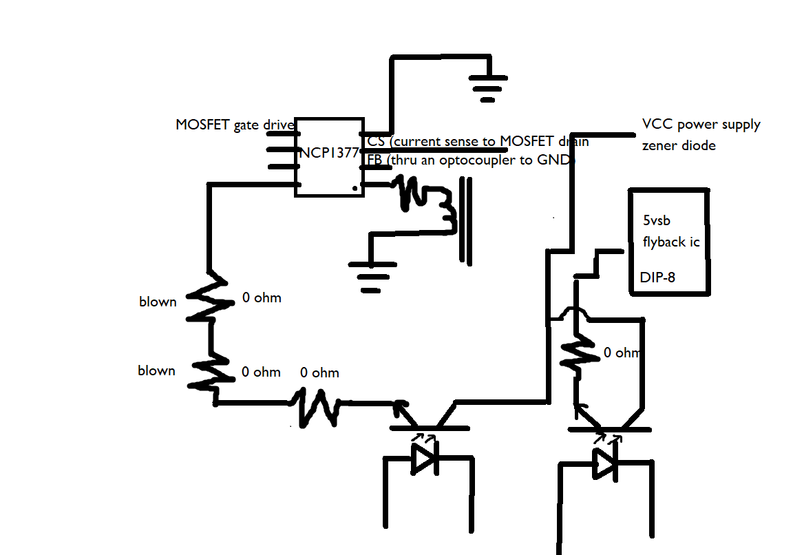 The single switching transistor is driven by a surface mount PWM controller at the underside of the board. I used a multimeter to check the zero fuse resistors, and have found 2 to be blown (I replaced them with jumper wire). They connect the PWM controller through an optocoupler, which are probably part of some voltage feedback circuit. It suggests that something might be shorted, maybe the PWM controller? I can't quite tell the markings on the PWM chip, but it appears to be an IR part.