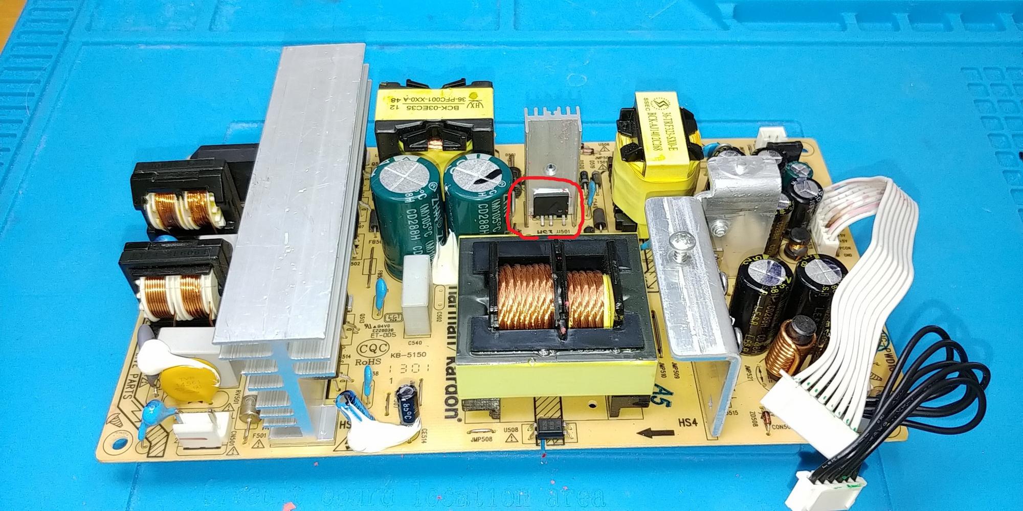 The root cause was that one of the SMPS ICs was blown up, which was only visible after a lid on a cooling body was removed (see attached picture).