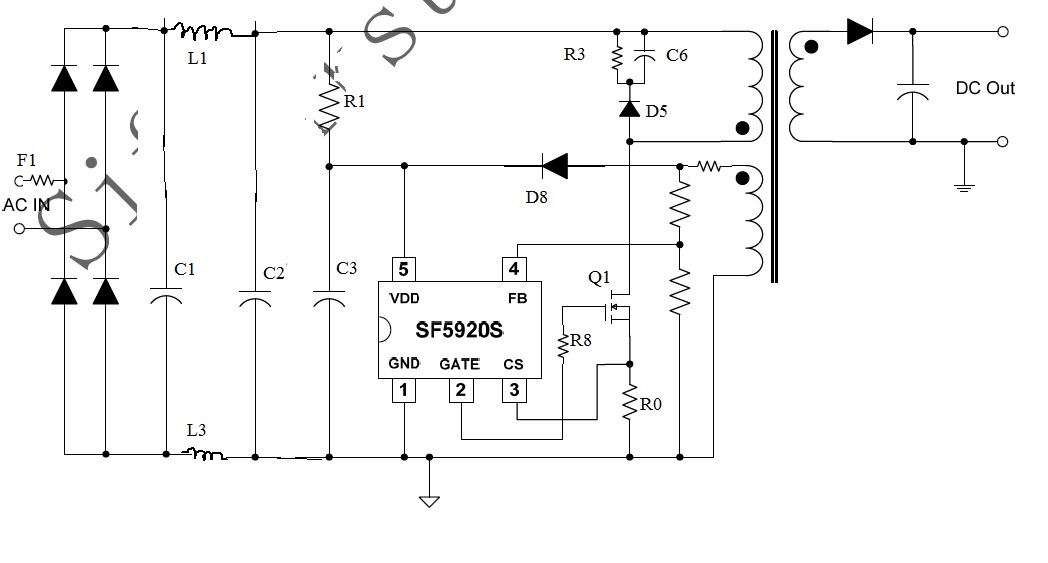 The SF5920S IC needs over ~15.5VDC to startup, ~9.5V it goes to UVLO shutdown, and ~33V is OVP shutdown.
