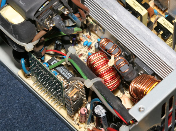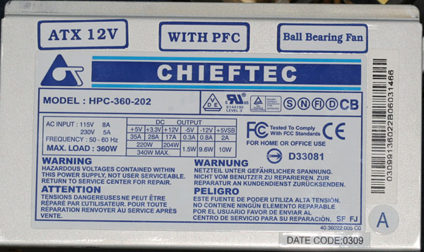 The PSU model is HPC-360-202 360W and an internet search revealed it appears to be made by High Power http://www.highpowersupply.com