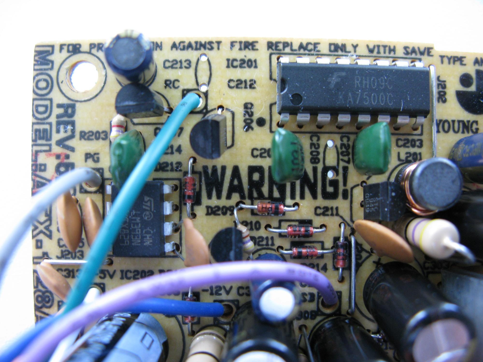 I've attached some pics of the unit and marked up one that have caps near the SMPS controller (a KA7500C, datasheet attached). C212 in the top left seems to be fairly obvious. The top lead connects with the top lead on the cap to its left (C213), which is connected to the screwhole (ground). I'm assuming that the negative lead of C212 should connect to ground (top hole)? For the cap south of the SMPS controller (C208), the top lead connects to pins 13/14/16 of the controller (13/14 are tied together) and the bottom lead connects to pin 4 of the controller. It seems to me that the positive lead goes towards the controller -- is this correct?