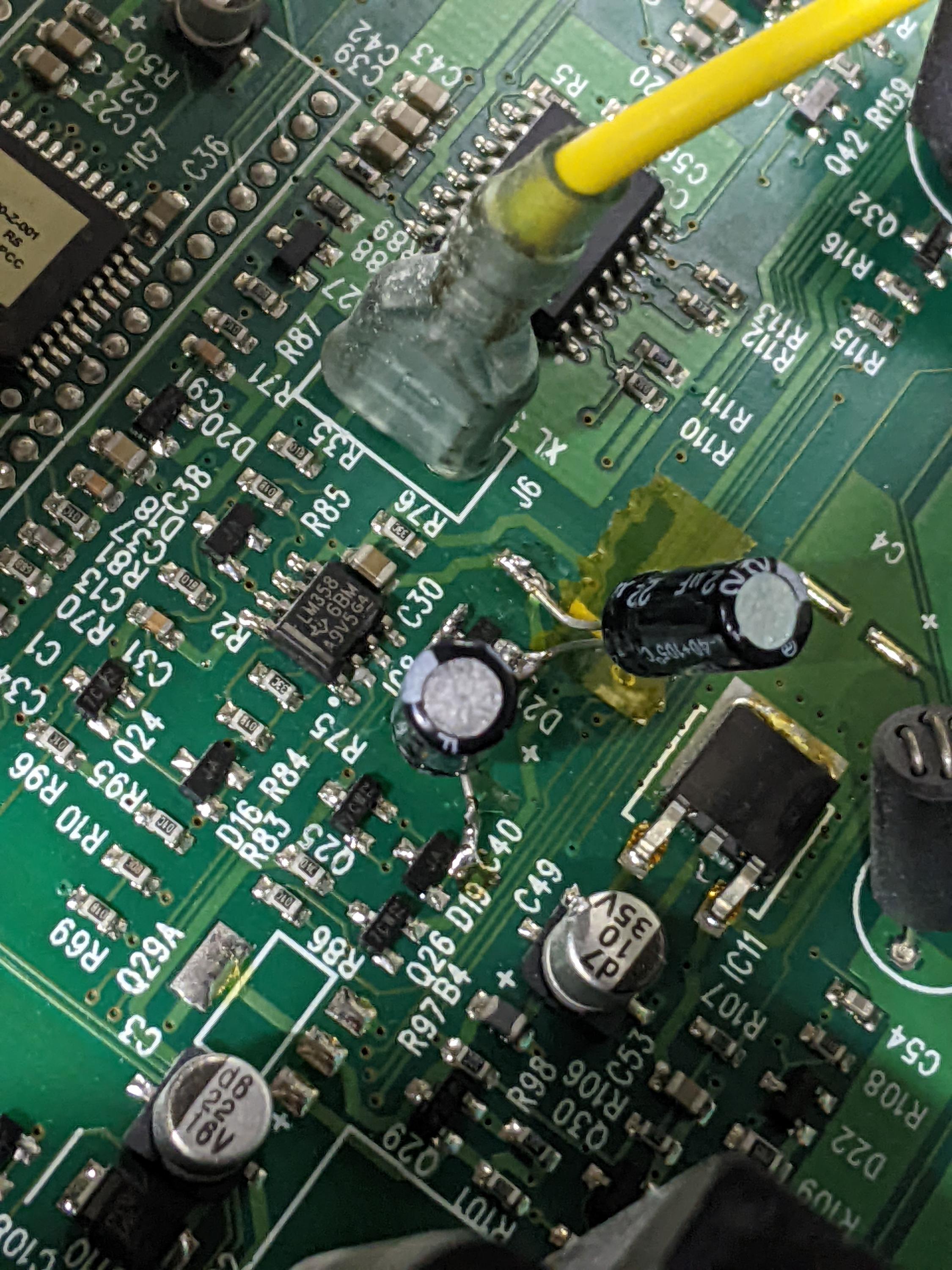 I just replace c40 & c41 & to my amazement it fixed the problem. Mine suddenly went to battery the other night even though it had ac power, and to think I have thrown at least 2 of this same model away over the last 2 years or so, wish I had know this sooner. FYI the cap installed in the above picture for c40 is backwards, (surprised no fireworks or blown) the polarity on the board is correct (the black edge on the old smt cap is negative)