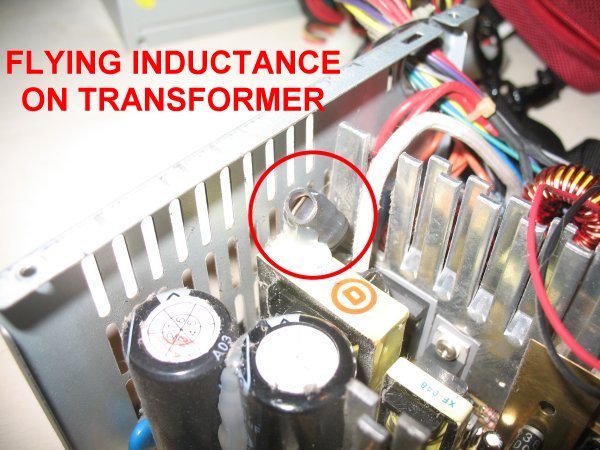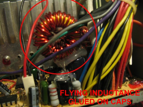 What surprise me is that there were two flying inductance: they cannot fit into the place on PCB so the manufacturer has glued them on the transformer and on output cap.