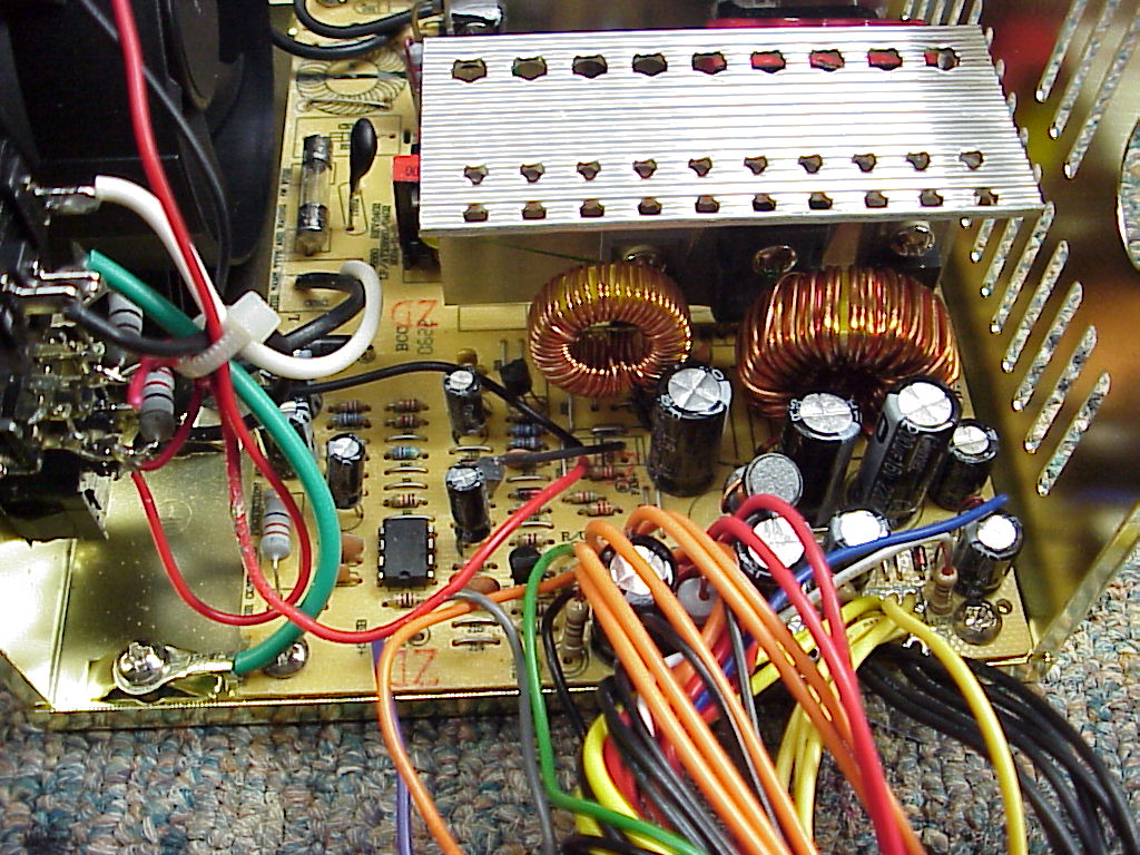 @ kc8adu: It looks like a Powmax/Leadman. First thing that gives it away is the bridge rectifier - powmax/leadman always mix diodes. In your case, it seems like a mix of 3 amp and 1 amp diodes. I have a Powmax LP6100D with a mix of 6amp/3amp diodes (since it's supposed to be "500" watts). The controller/pwm layout also seems very similar to my Powmax. Lastly, you have the voltage switch mouted on the front of the PSU. I bet the fan is Yate Loon too.