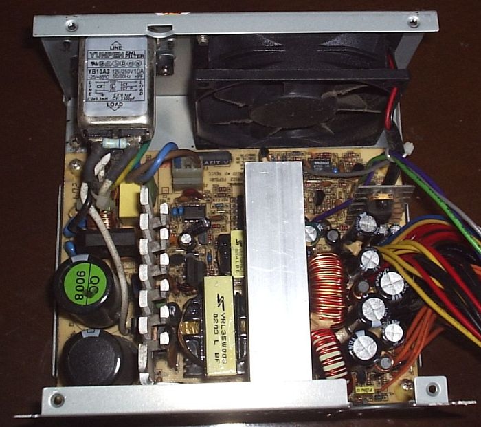 Also bought it for $5, second hand. Tested good before recapping. Fan is an 8cm Adda (seems like pwm controlled, it runs silent). Secondary caps are a lot of 12,5mm JP CE-TUR. Nice, it is easy to recap. A 100uf 50V OST was found near the main transformer. A Rubycon YXF is a good replacement for it.