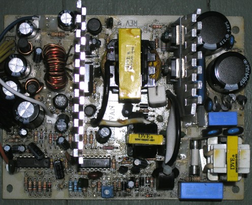 DVE (Dee Van Electronics) DVS-1454P from 1996, Rubycon USP 470uF 200V primary units, CapXon KM series (2200uF 16V before output inductor on +12V, 1000uF 16V after output inductor on +12V, 3300uF 6.3V after output inductor on +5V, 1000uF on -12V rail ) with one "WC" brand (HL series) 6800uF 6.3V unit before output inductor on +5V, as well as a couple of low-value Jamicons.