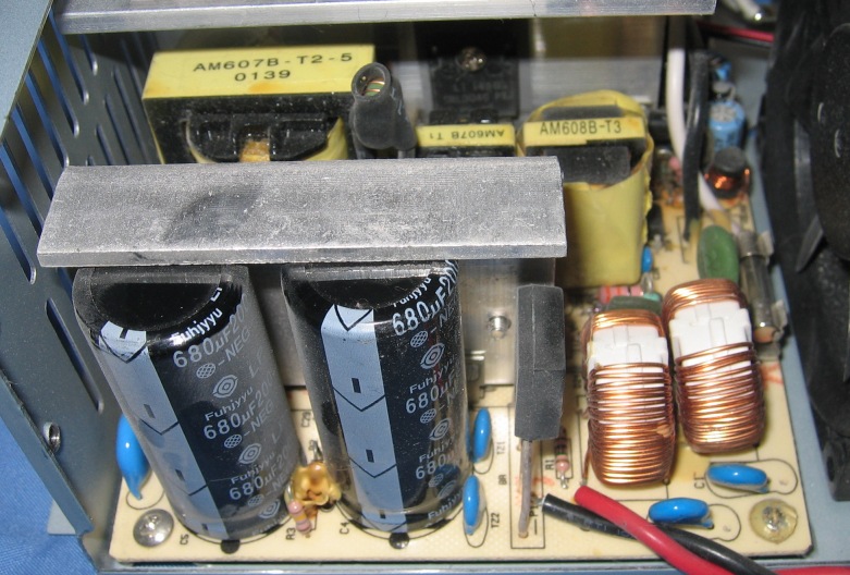 Teapos on the input side, Teapo and G-Luxon on the output. Seems to be also a couple of Jenpos in there. This PSU also had an inductor screwed to the top cover, like the Suntek one.