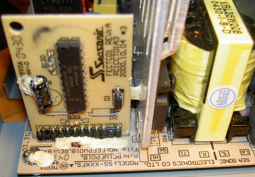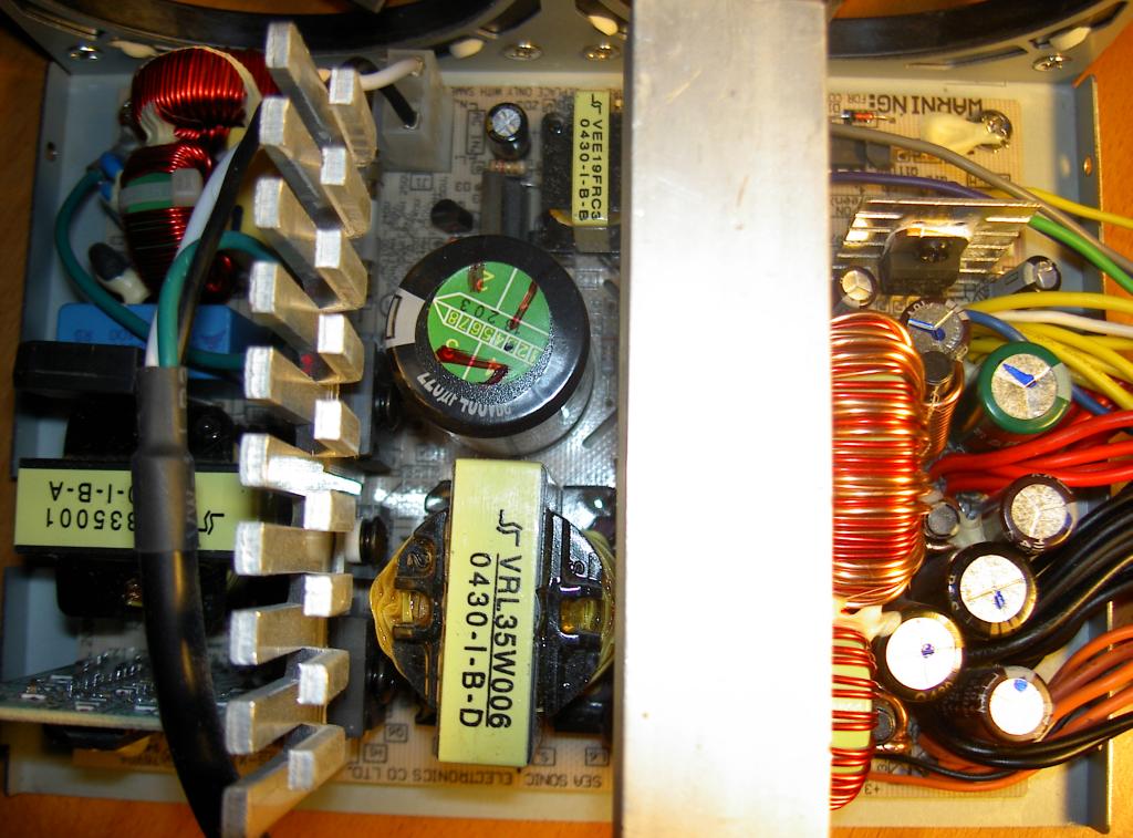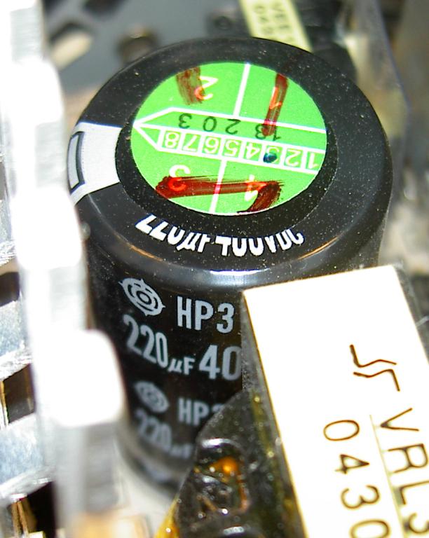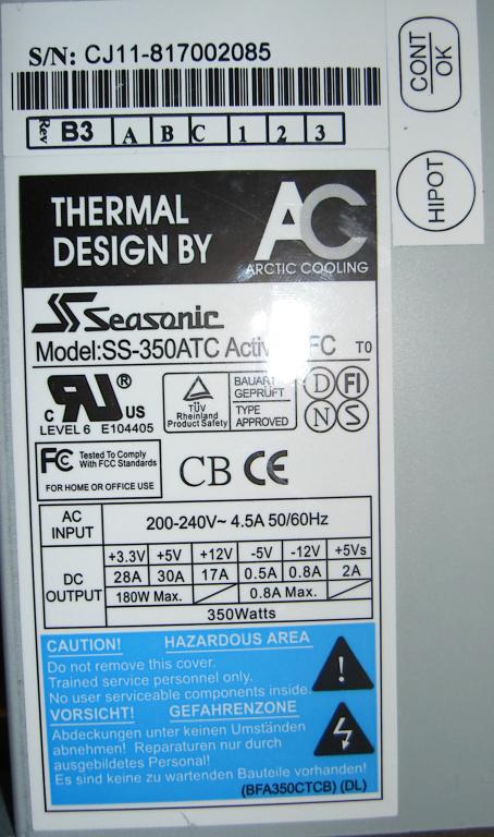 It has a 220uf primary cap that I would really like to know what manufacturer it has, according to an e-mail I got from Seasonic they use Hitachi caps in their powersupplies... It is makred "HP3 85°C 220uF 400VDC" and "38B5" on it's back... with this logo: