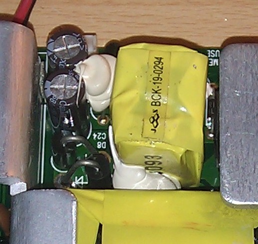It is rare for transformers to fail on smps. Usually, a failed transformer will be indicated by severe charring or dark colouring of the windings and perhaps cooked pcb pads. Your transformer is in pristine condition and it is not the main switching transformer but more likely a feedback isolation transformer.Right, I've managed to isolate the noisy component - a transformer labelled "BCK-19-0294".