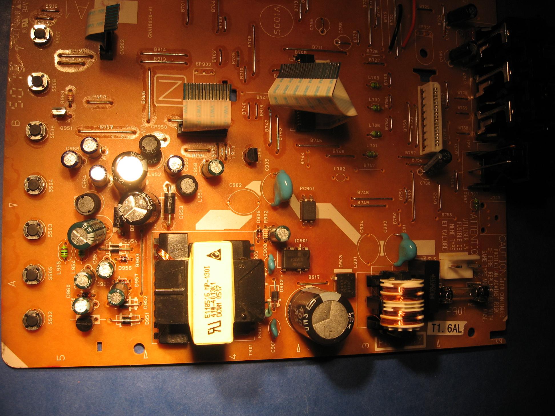 There is an obviously bulged cap at C983 (Samxon GF (M) 470uF 10V), but I haven't replaced that yet, as I'm trying to work through the power board checking as much as I can before I get to that cap.