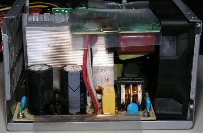 Between the two main caps there is a ceramic capacitor which has burnt. There appears to be leaking from the bungs of the main caps which has travelled up onto the pcb on the top near the fan. (as the psu would have been upside down in the case) i am not sure about that though. All the caps are Jun Fu.