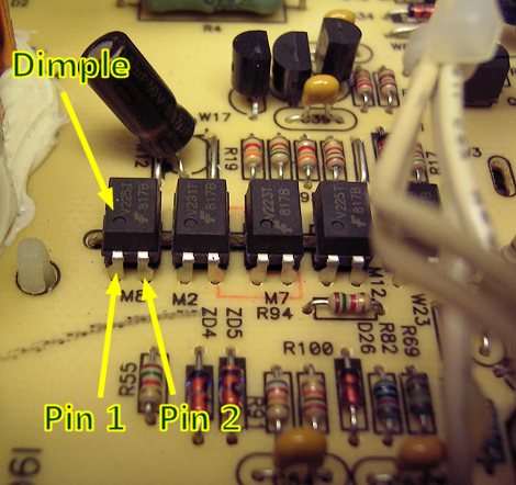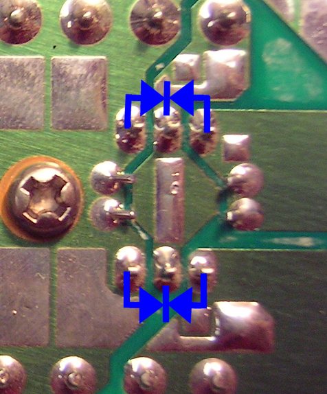Here we go. See the pics as to what these devices are and where to unsolder two legs of each. Wiggle the leads around slightly to make sure you don't have contact to the foil traces. You can use the continuity test on the meter to be sure.