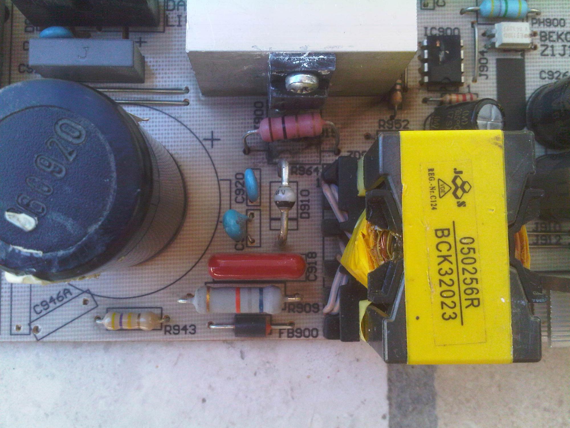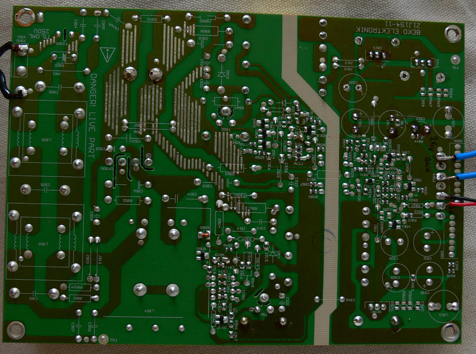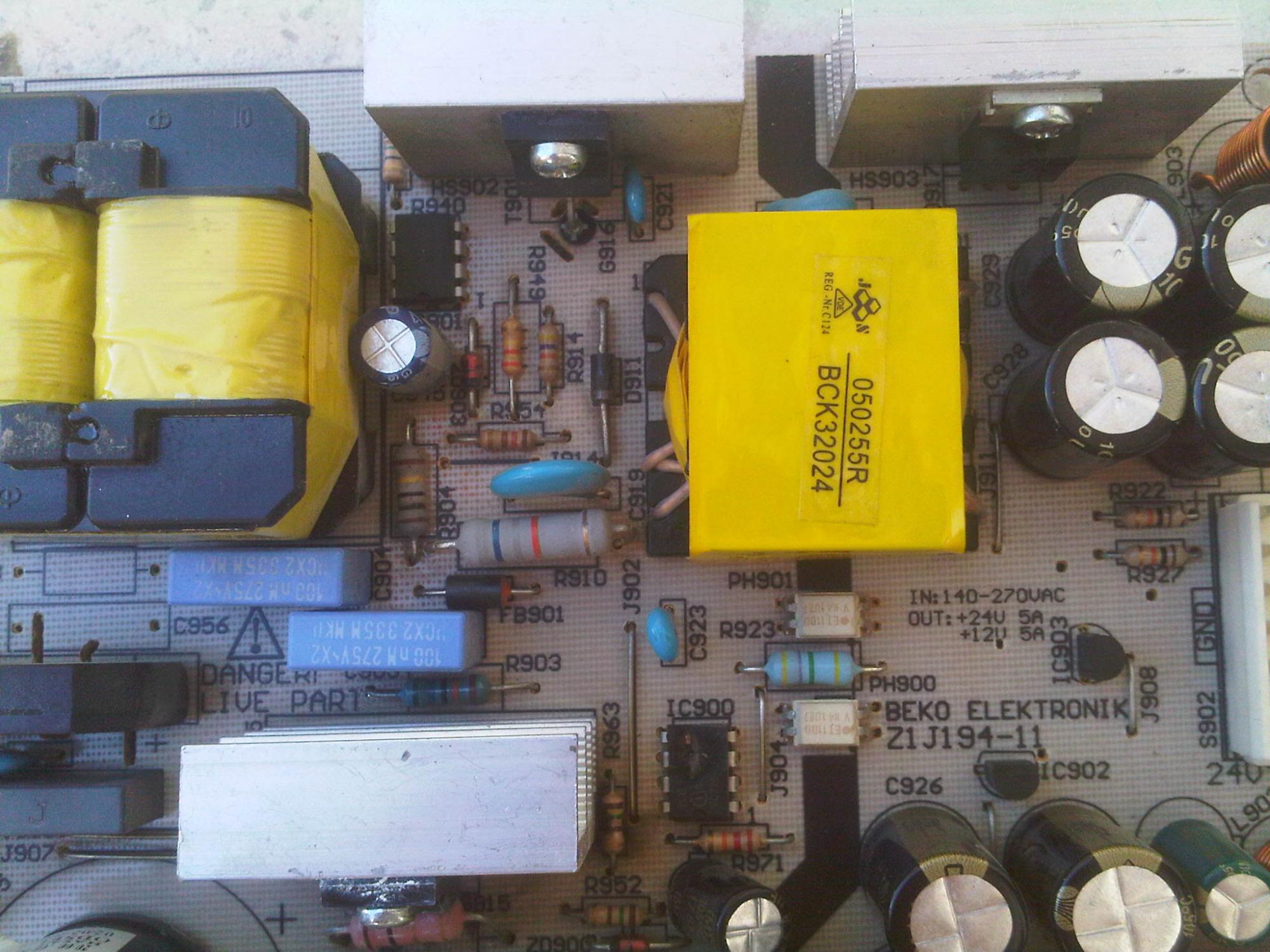 Chassis / inside are made by Beko. Power supply's basically two flyback converters on the same board. Silkscreened on the board it says the outputs are 24v @ 5A and 12v @ 5A. Controllers are Infineon ICE1QS01. Caps are / were 3x G-Luxon LU 680u/35v and an LZ 220u/35v on the 24v output, and 4x Daewoo RF 1000u/25v on the 12v output.