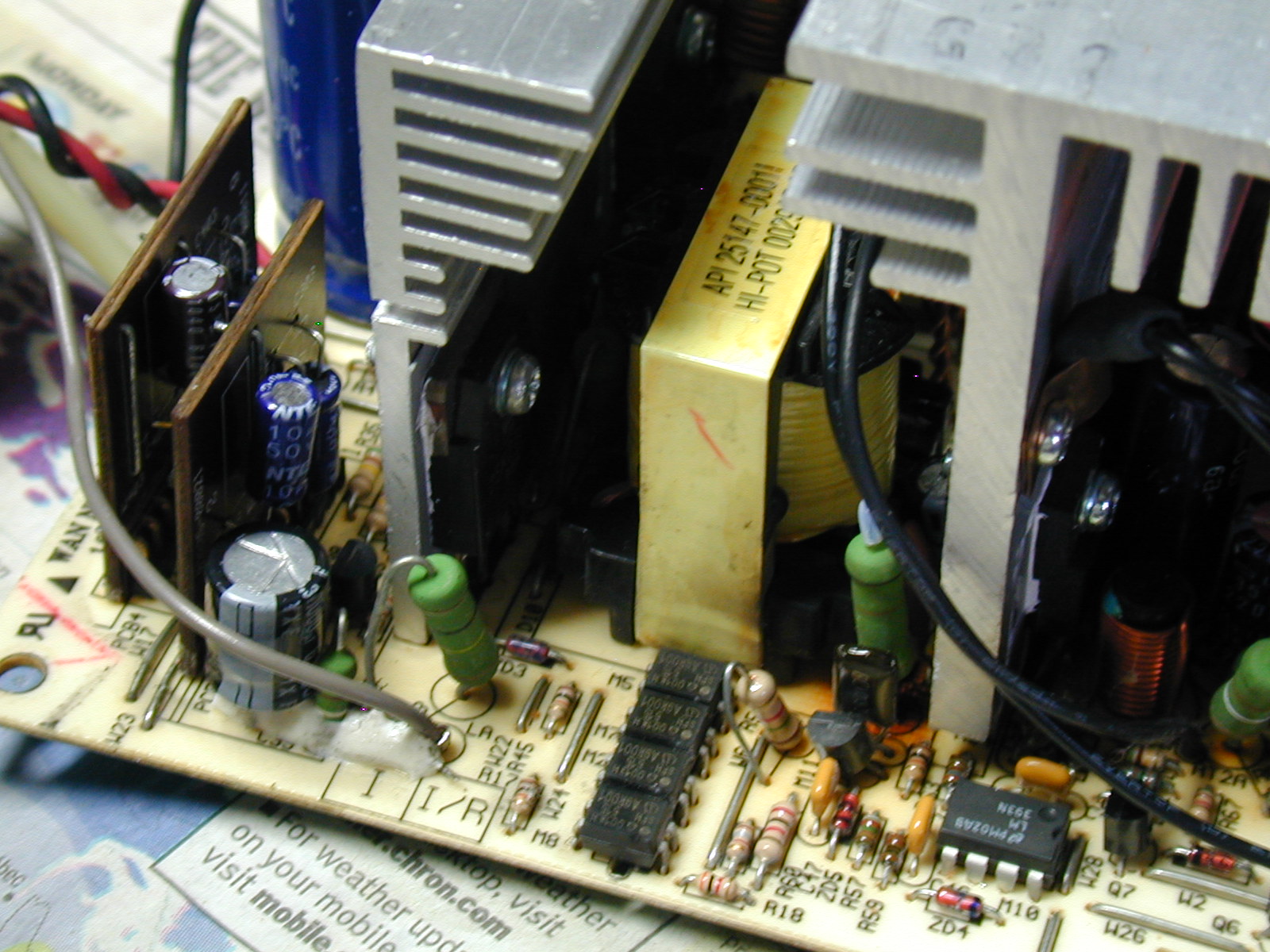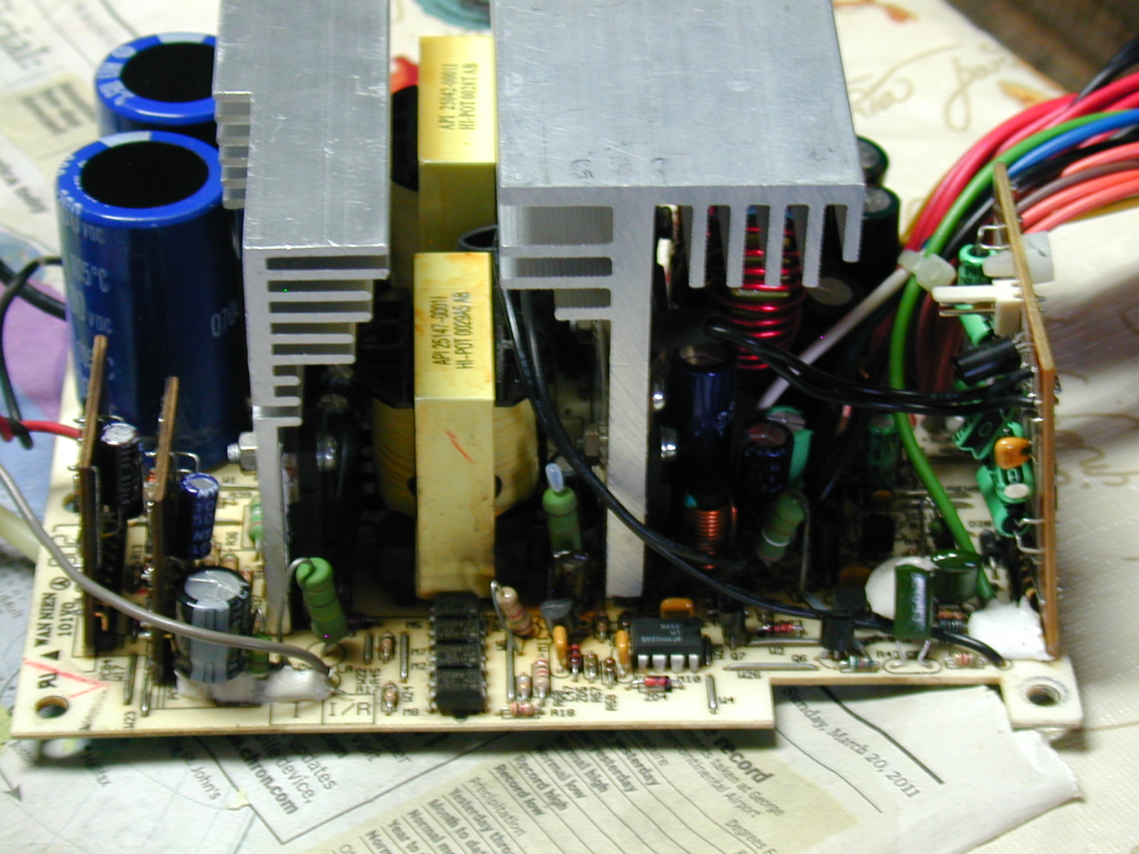The AcBel 9841-291 power supply stopped working. No power, no fan twitch. I did some searching and read that the little 10uF, 2.2uF on a couple daughter boards go bad. I checked and yes they were out of spec and open. Also some small 100uF and 47uF on the main board were out of spec. All the big caps were good brands and are in good shape. (I have a ESR-micro 3.1) I replaced those little caps and the power supply powers-on ok with good voltages, but something is making a high pitched whine that gets louder with time (and, I'm guessing, heat). The PS powers the computer ok for a while but shuts off after a time. The sound is ignorable but I'm mentioning it as a possible clue as to what's going on.