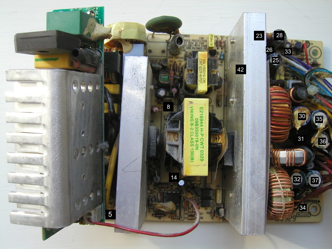 I decided to recap my SL350P after the computer started to crash very often, and I noticed that some caps on the mainboard were bulging (about this in a later thread). So I opened the PSU also, and it was full of Fuhjyyu's (Antec's favourite brand, it seems), with one capacitor already bloated.