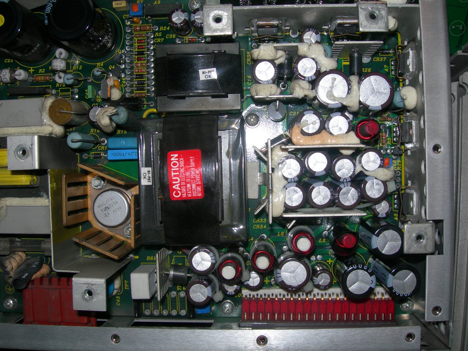 This is a very nice power supply and an example of sheer overengineering. Look at the sheer number of capacitors on just one rail - 8 x 35V 1000uF (for the +15V supply, which runs the CRT and fan, and nothing much more.) On the +3.5V rail, there are 3x 6.3V 6800uF. So for now I'm going to rule out the capacitors as being the problem. No bulging or bloating anywhere on the caps.